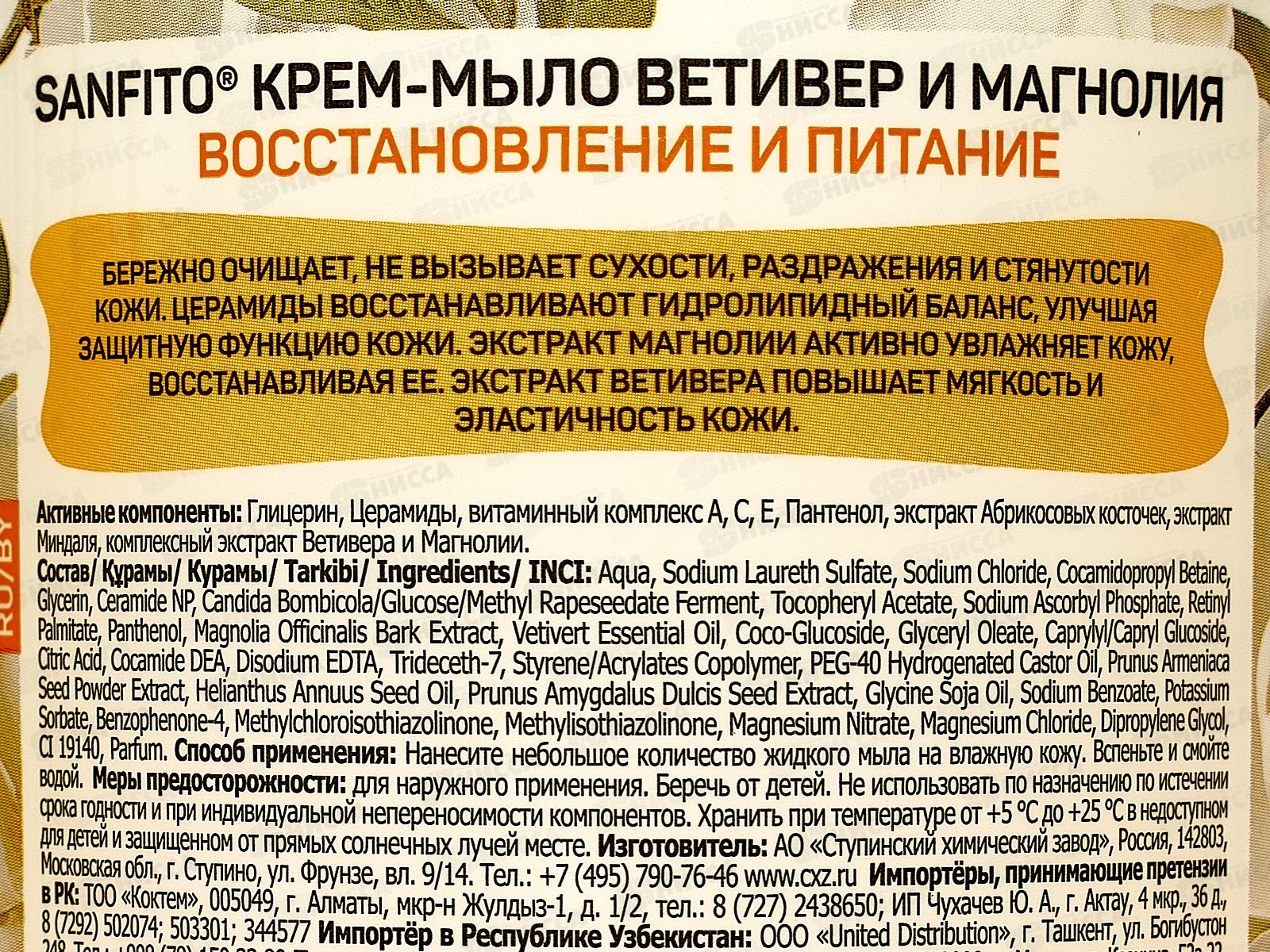 Sanfito крем-мыло Ветивер и магнолия Восстановление и питание 1000мл