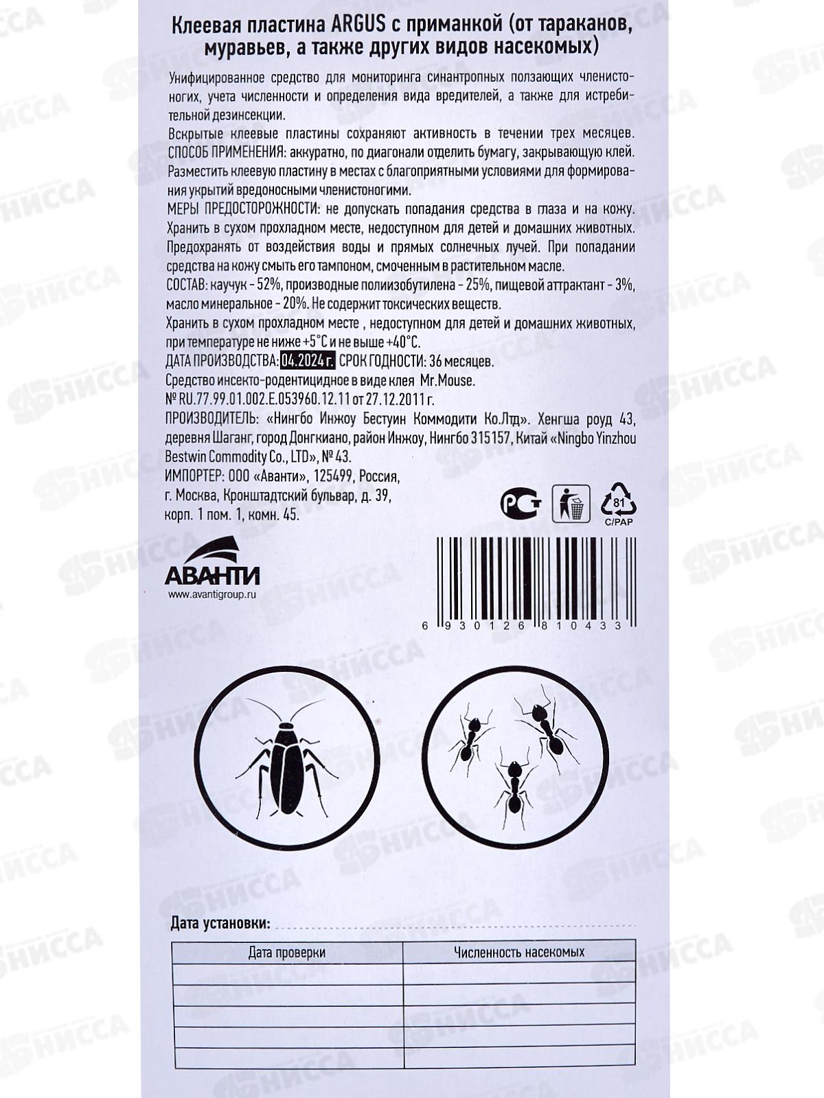 АРГУС Клеевая пластина с приманкой от тараканов и муравьев (19,2см х 9,2см) AR-1043 *10/30