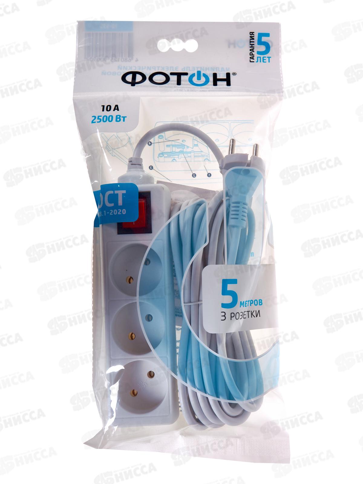 Код:498907; Удлинитель ФОТОН 10-53S 5м 3розетки 10А выключатель, белый *20