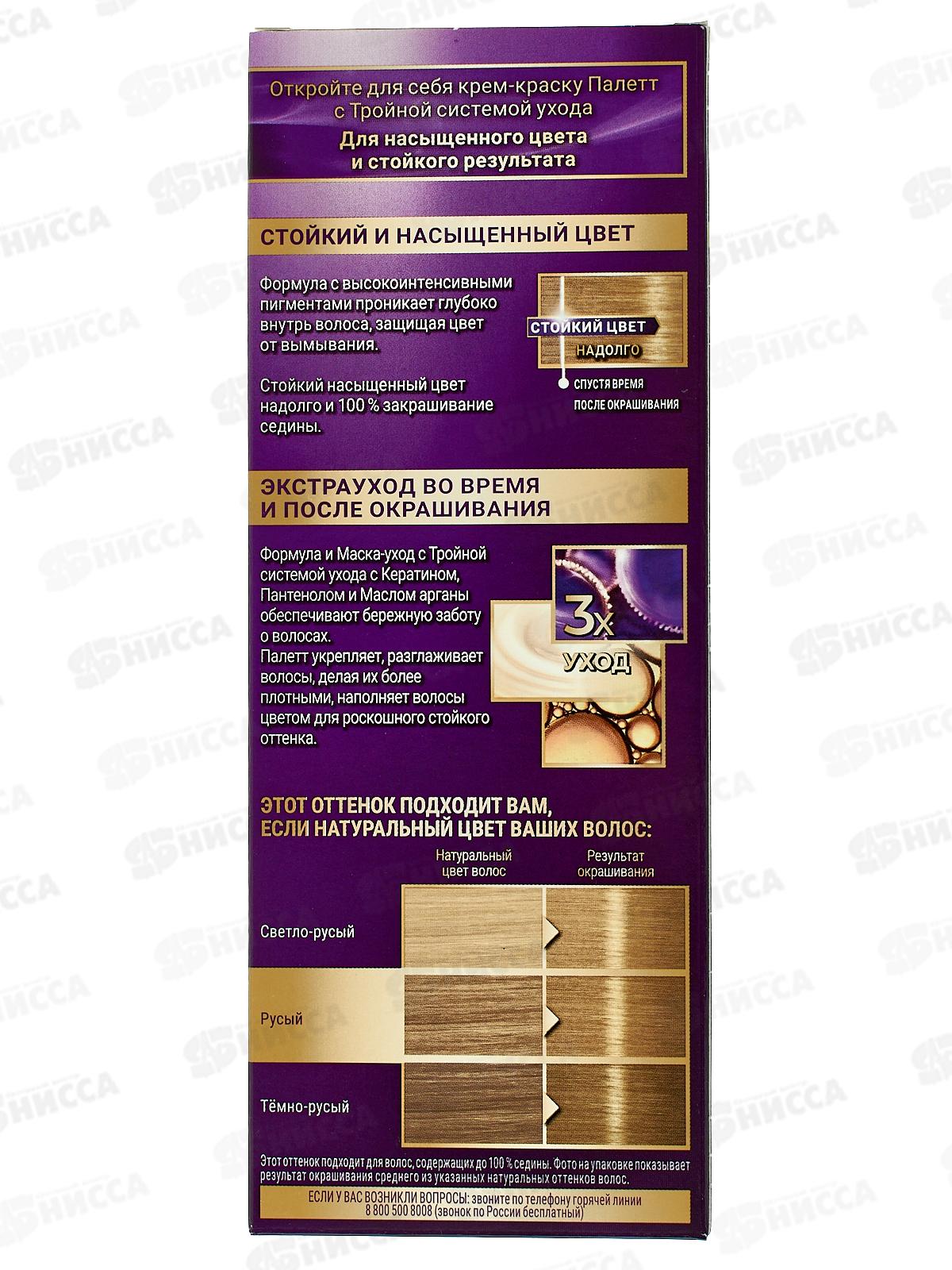 Откройте для себя Стойкую крем-краску Палетт с Тройной системой ухода с Кератином, Пантенолом, Nutri-маслом, обеспечивающей бережную заботу о волосах. Формула с высокоинтенсиными пигментами глубоко проникает в структуру волоса, защищая цвет от вымывания. Для стойкого и интенсивного цвета. Ухаживающая краска, обогащенная пленительным цветом Ваших волос, удовлетворяющим все ваши потребности: насыщенный, экстрастойкий оттенок, ухоженные волосы, даже при регулярном окрашивании, живой блеск. Надежное закрашивание седины.