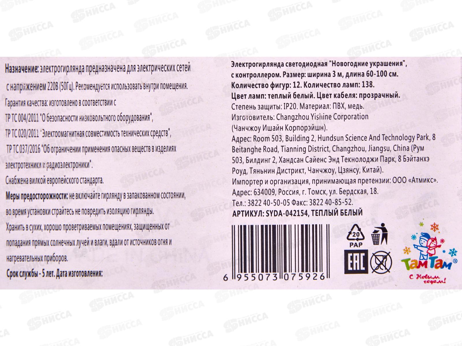 Гирлянда Новогодние украшения, 3м д. 60-100см, 12ф., 138л, SYDA-042154