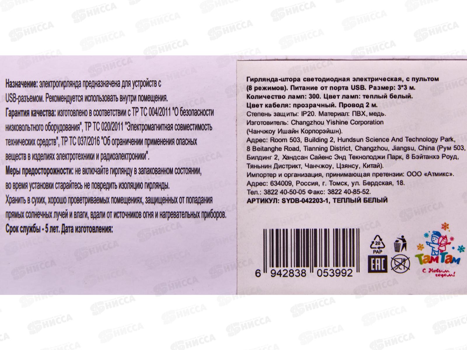 Гирлянда-штора светодиодная, 3 х 3м, 300ламп, теплый белый SYDB-042203-1