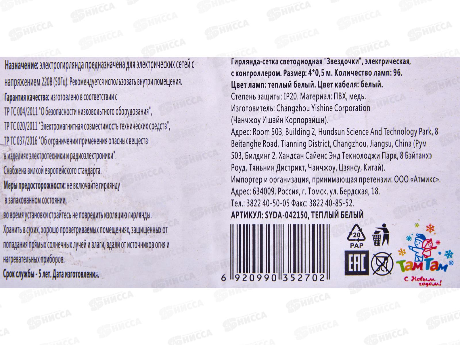 Гирлянда-сетка Звездочки, 4 х 0,5м, 96ламп, теплый белый SYDA-042150