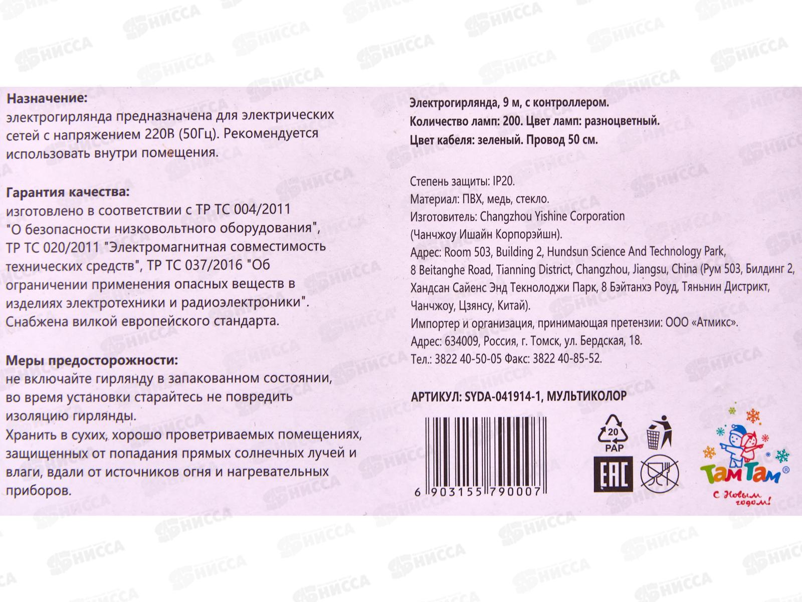 Гирлянда электрическая 9м 200ламп, мультиколор, SYDA-041914-1 АТМ