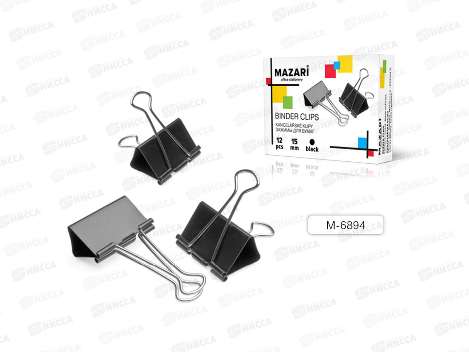 Код:203759; Зажим для бумаг MAZARI М-6894 15мм 12шт черный, металлический *12