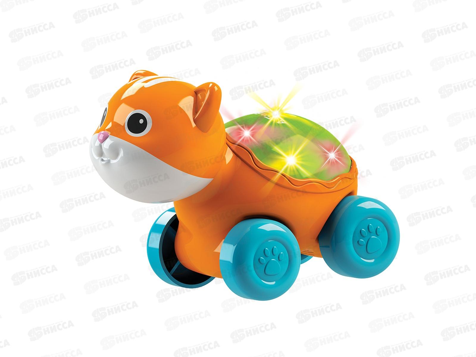 Этого милого котика не просто так зовут Светяшкой! Он весь светится разноцветными огоньками – малышу нужно только нажать ладошкой на спинку игрушки. Котик Светяшка – музыкальный: он поет 6 веселых песенок и мелодий («Песенка про ферму», «Стало солнышко теплей», «Топ-топ, топотушки», «Весёлая карусель» «Немецкая полька», «Чижик-пыжик»). А еще у котика есть колесики, и ребенок сможет покатать его.