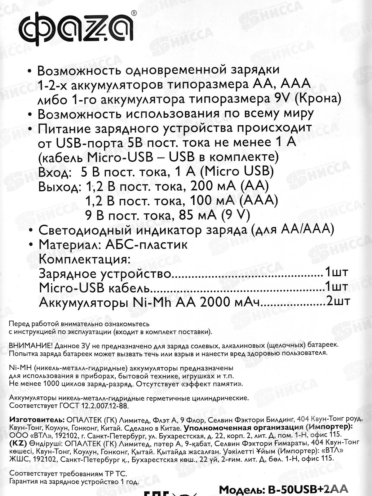 З/у ФАZA B-50USB (2*AA/AAA, 1*9V) +2*AA 2000мАч
