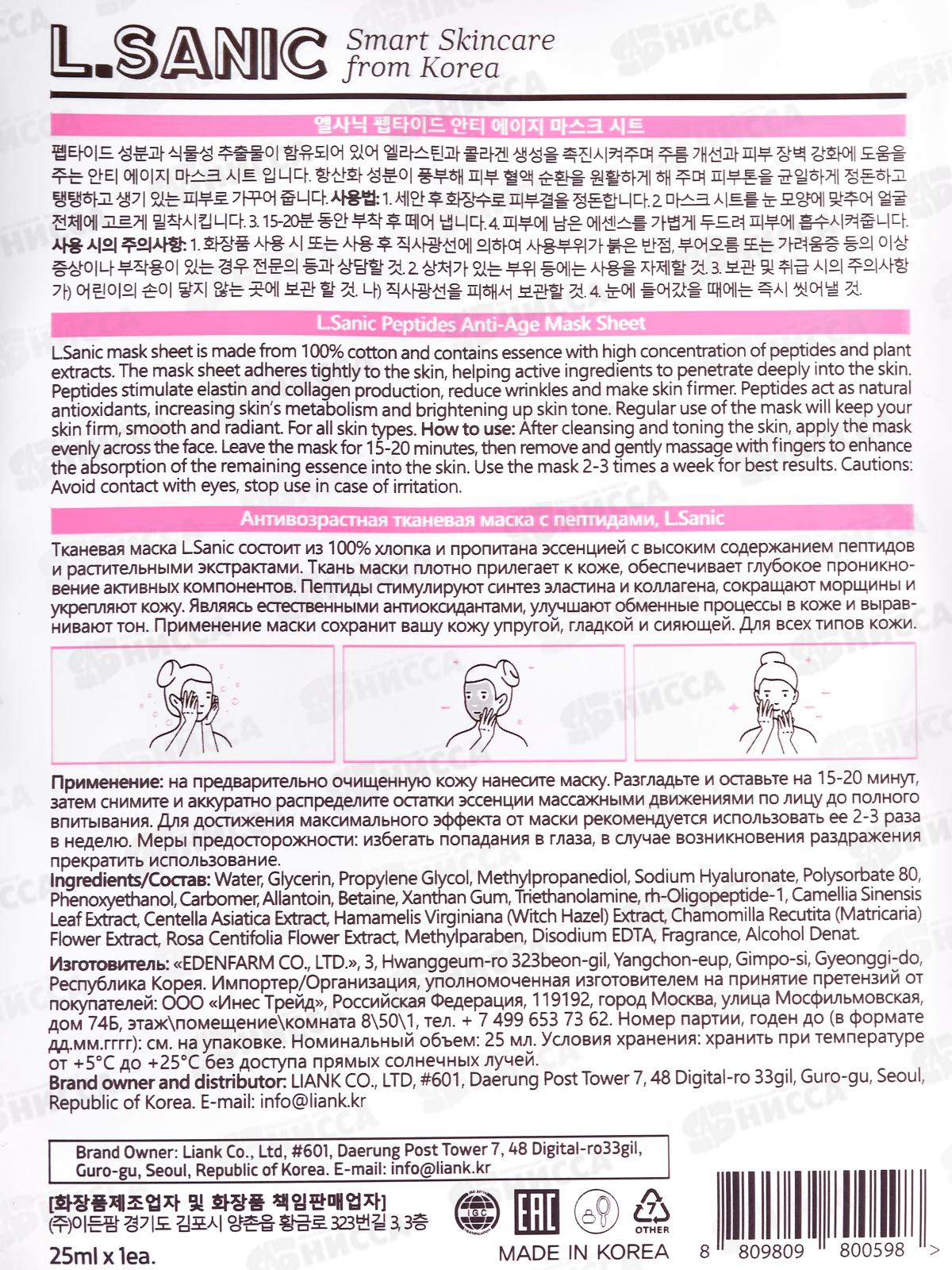 L.Sanic Маска тканевая антивозрастная с пептидами 25мл