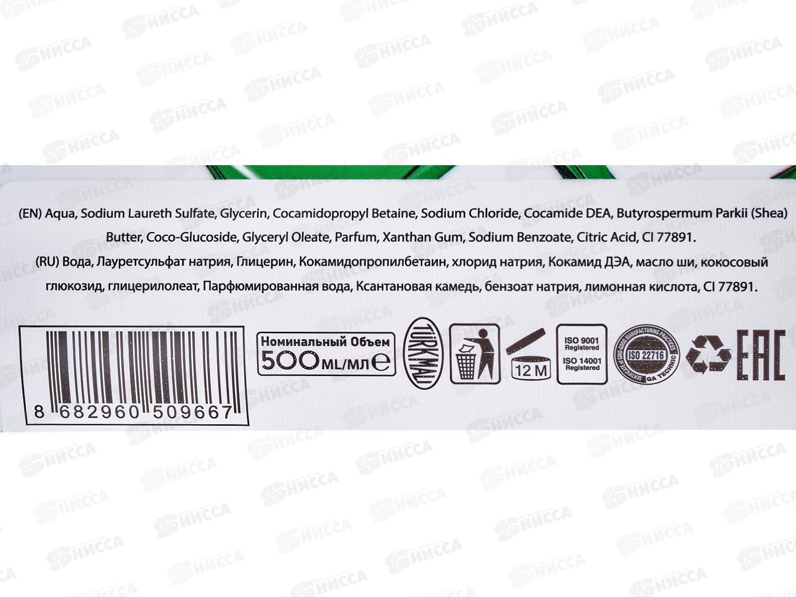 Состав: Вода, Лауретсульфат натрия, Глицерин, Кокамидопропилбетаин, хлорид натрия, Кокамид ДЭА, масло ши, кокосовый глюкозид, глицерилолеат, парфюмированная вода, ксантановая медь, бензоат натрия, лимонная кислота, бензилсалицилат, гексилциннамал, CI 77891