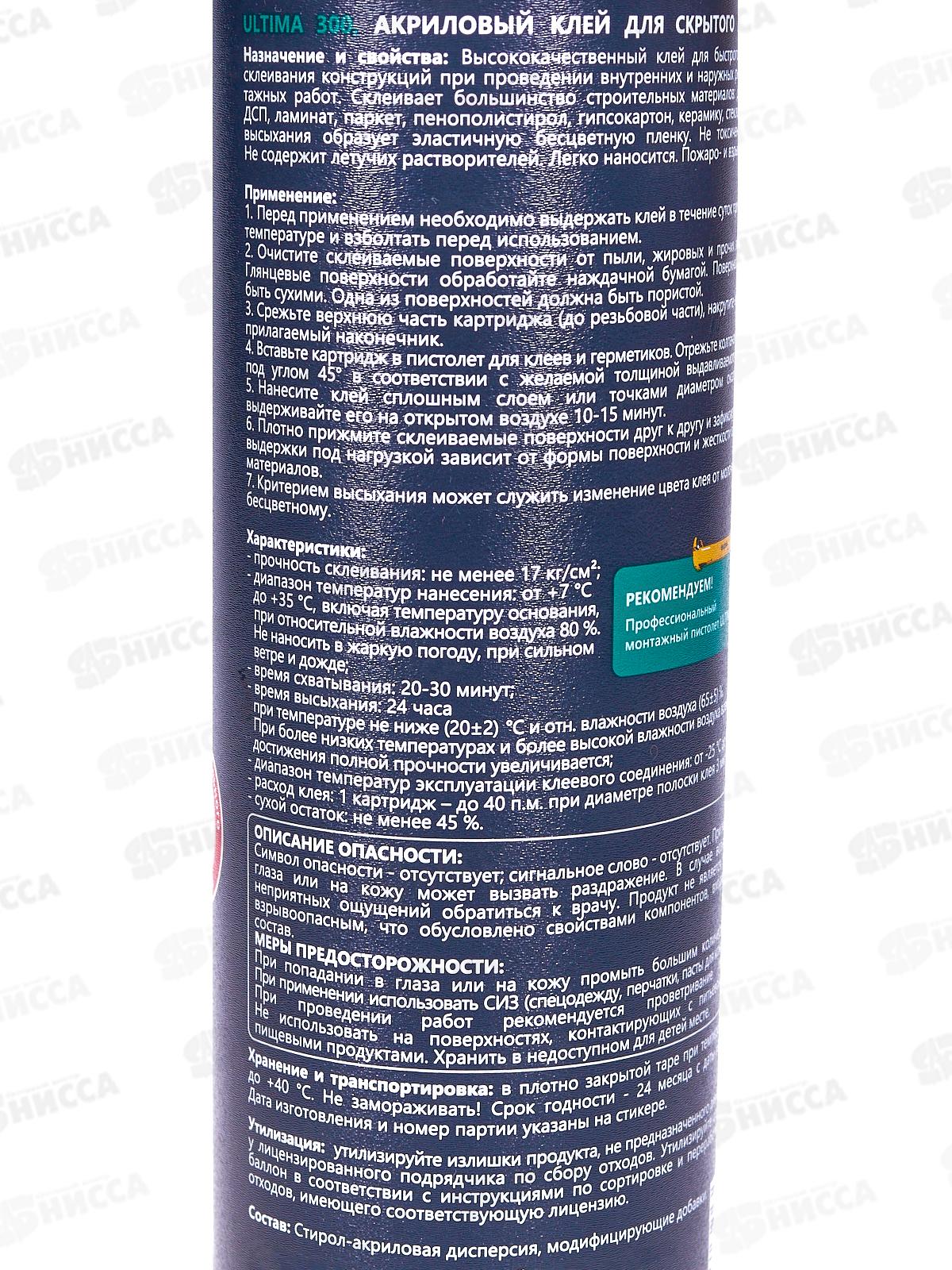 Клей ULTIMA 300 акрил для скрытого монтажа, прозрачный, картридж 300г *12