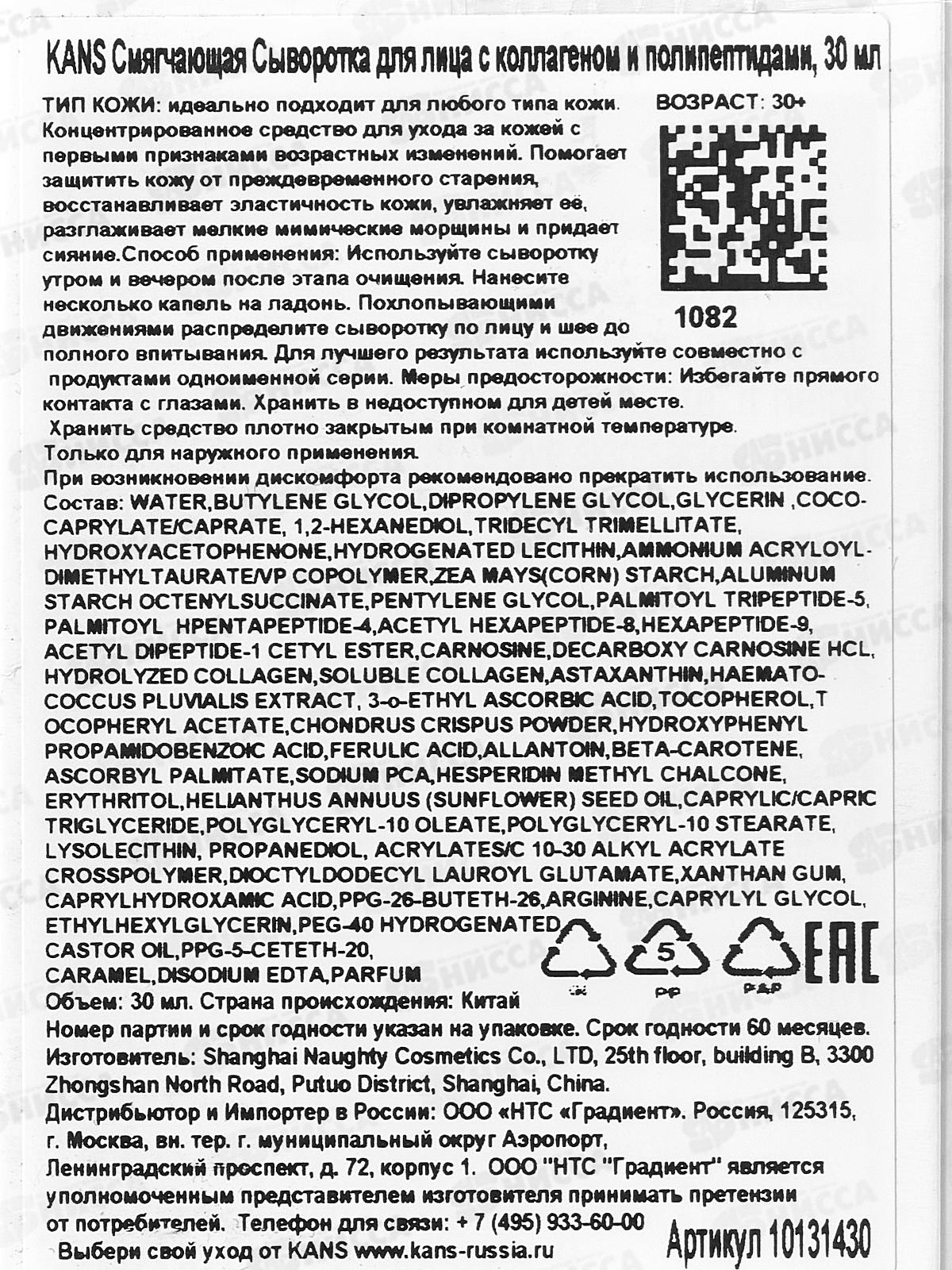 KANS Смягчающая сыворотка для лица с коллагеном и полипептидами 30мл