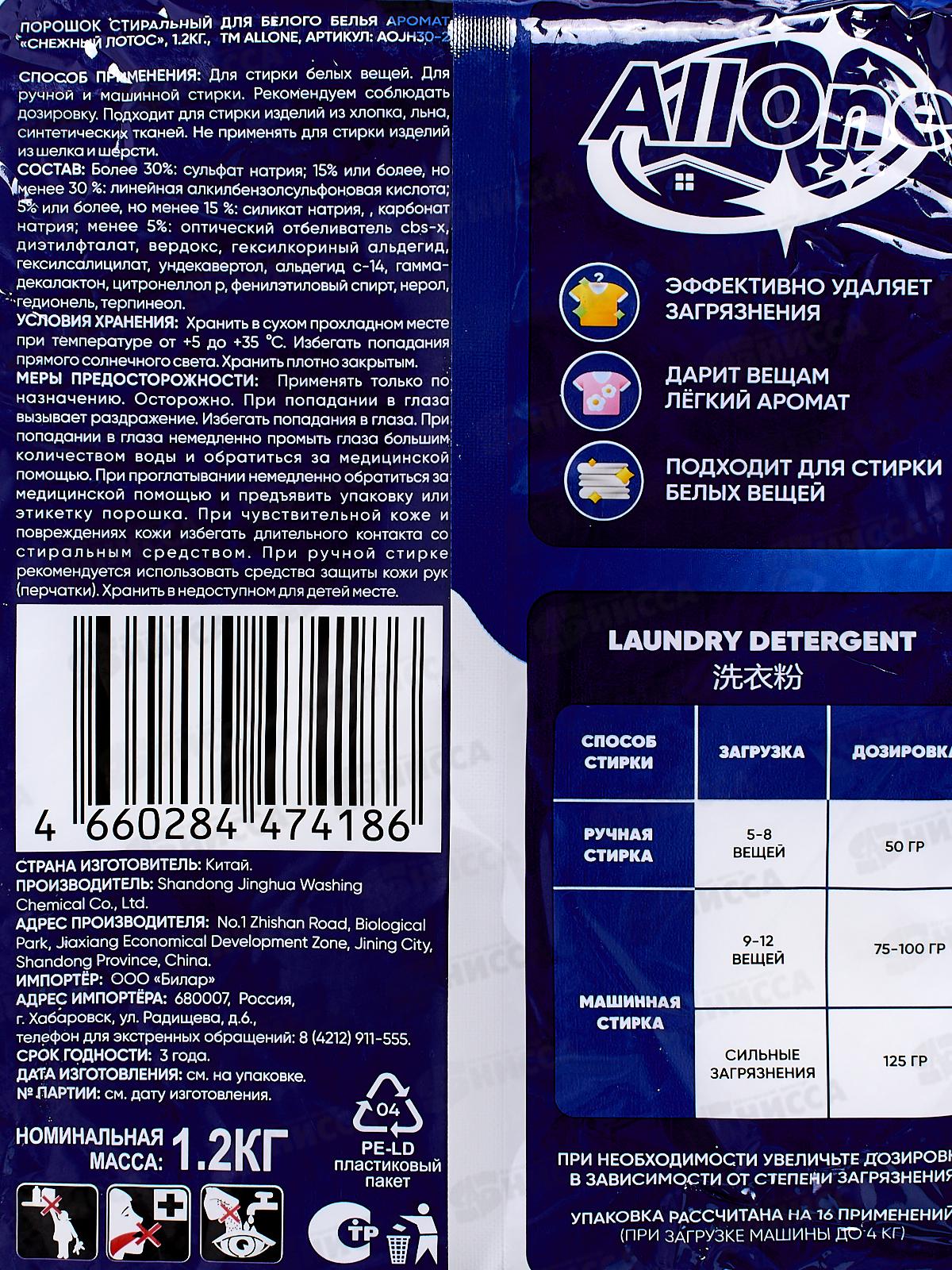 Allone порошок для стирки 1,2кг Снежный лотос для белого *10