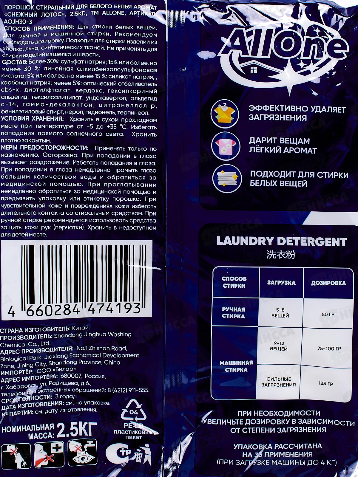 Allone порошок для стирки 2,5кг Снежный лотос для белого *4