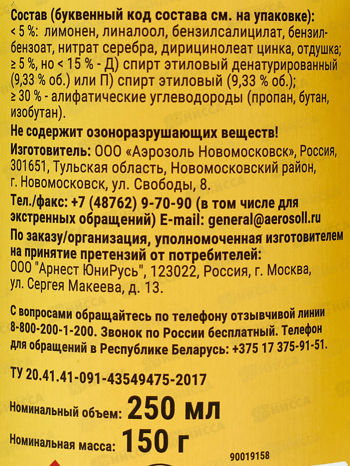 Состав: менее 5%: лимонен, линалоол, бензилсалицитат, бензилбензоат, нитрат серебра, дирицинолеат цинка, отдушка; более 5%, но менее 15%: спирт этиловый денатурированный, спирт этиловый (9,33% об.); более 30%: алифатические углеводороды (пропан, бутан, изобутан). Важно: продукт не содержит озоноразрушающих веществ.