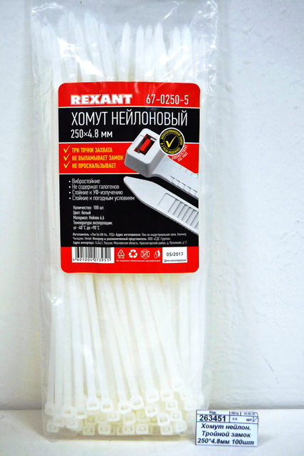 Код:263451; Хомут нейлоновый Тройной замок 250*4.8мм 100шт белый Rexant *10