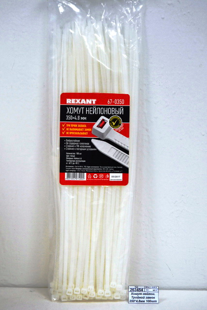 Код:263454; Хомут нейлоновый Тройной замок 350*4.8мм 100шт белый Rexant, 67-0350 *10