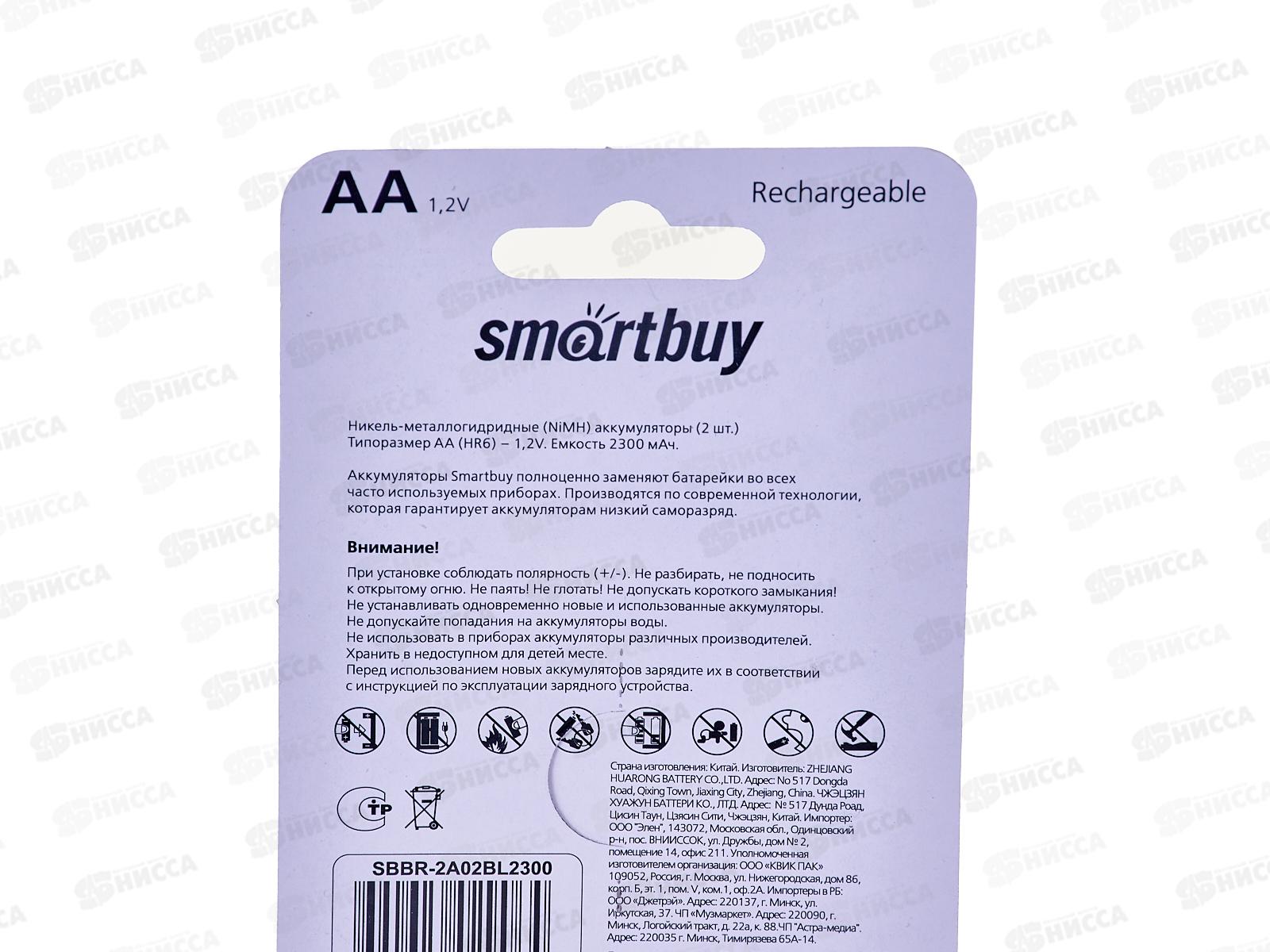 Батарейка Аккумулятор SmartBuy R6 AA 2300мАч, NiMH, 2BL, SBBR-2A02BL2300 *2/24/240