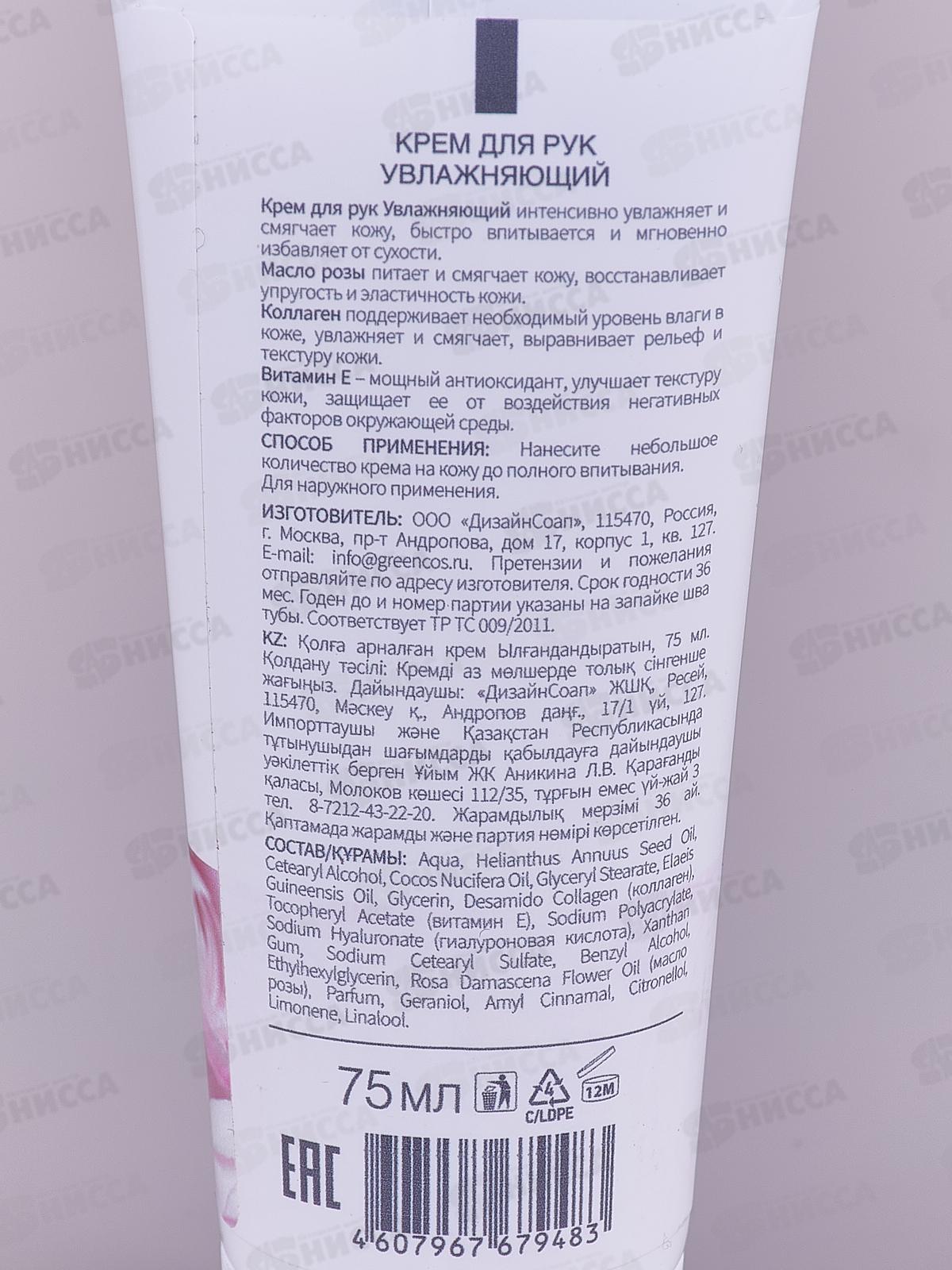 Состав: вода, Масло семян Helianthus Annuus, Cetery! Спирт, масло кокосового ореха, глицерилстеарат, масло Elaels Guineensis, глицерин, дезамидоколлаген (коллаген), токоферилацетат (витамин Е), полиакрилат натрия, Гиалуронат натрия (гиалуроновая кислота), Ксантан Камедь, цетеарилсульфат натрия, бензилэтилгексилглицерин, масло цветков розы дамасской (масло розы), отдушка, гераниол, амилциннамал, цитронеллол, лимонен, линалоол.