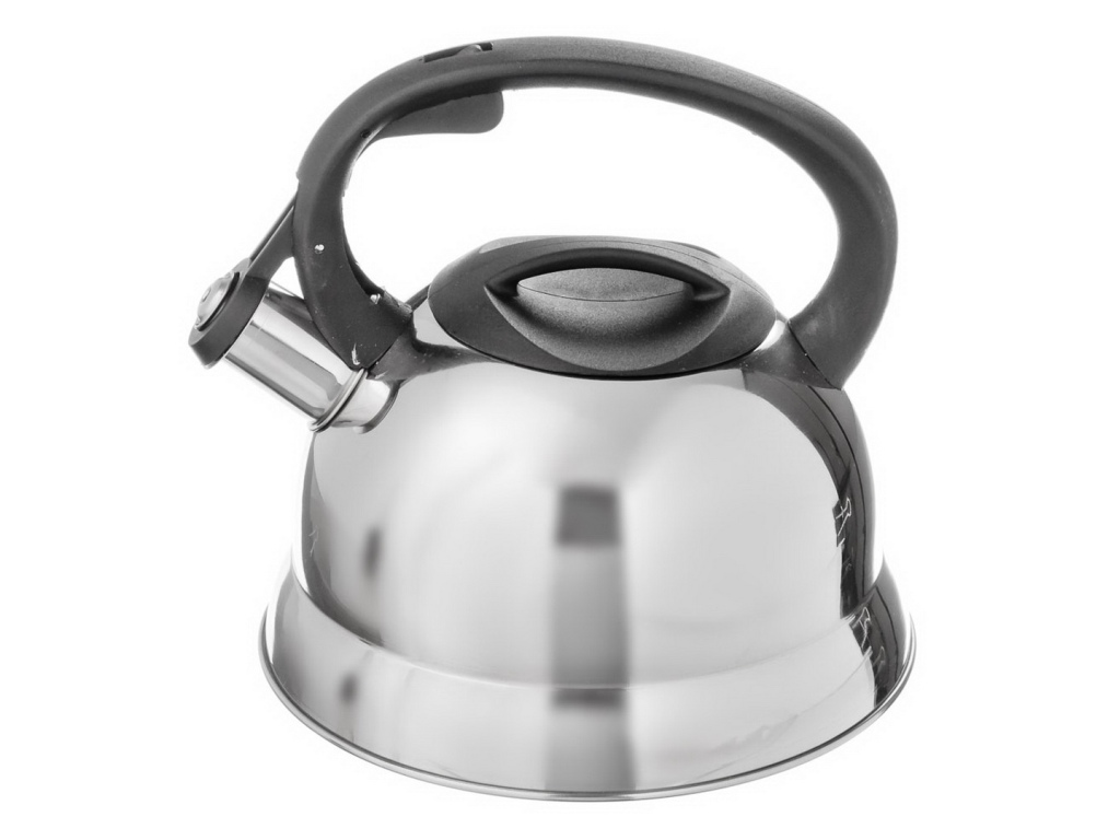 Чайник объемом 2,5 л изготовлен из нержавеющей стали, зеркальный, с несъемным свистком и бакелитовой ручкой черного цвета, подходит для всех типов пли...