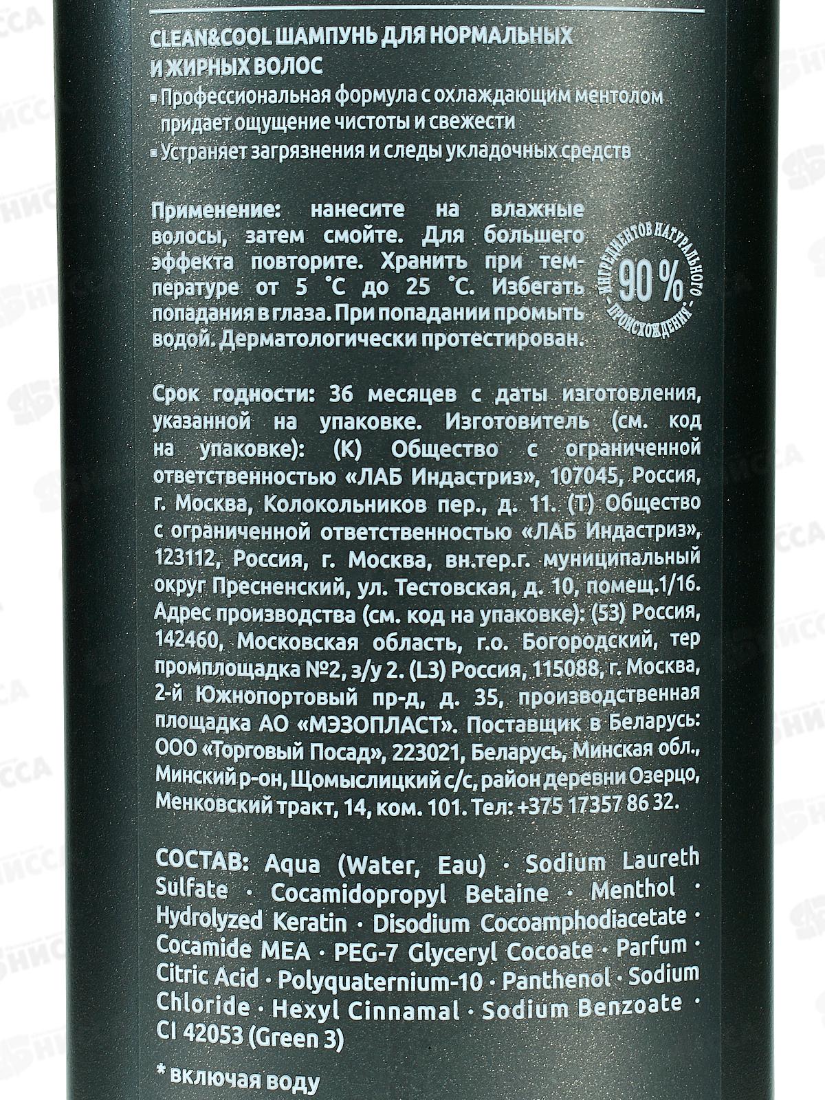 Состав: вода, лауретсульфат натрия, кокамидопропилбетаин, ментол, гидролизованный кератин, динатриевая соль кокоамфодиацетата, кокамид МЭА, ПЭГ-7 глицерил кокоат, отдушка, лимонная кислота, поликватерниум-10, пантенол, хлорид натрия, гексилциннамаль, бензоат натрия, CI 42053 (Зелёный 3)