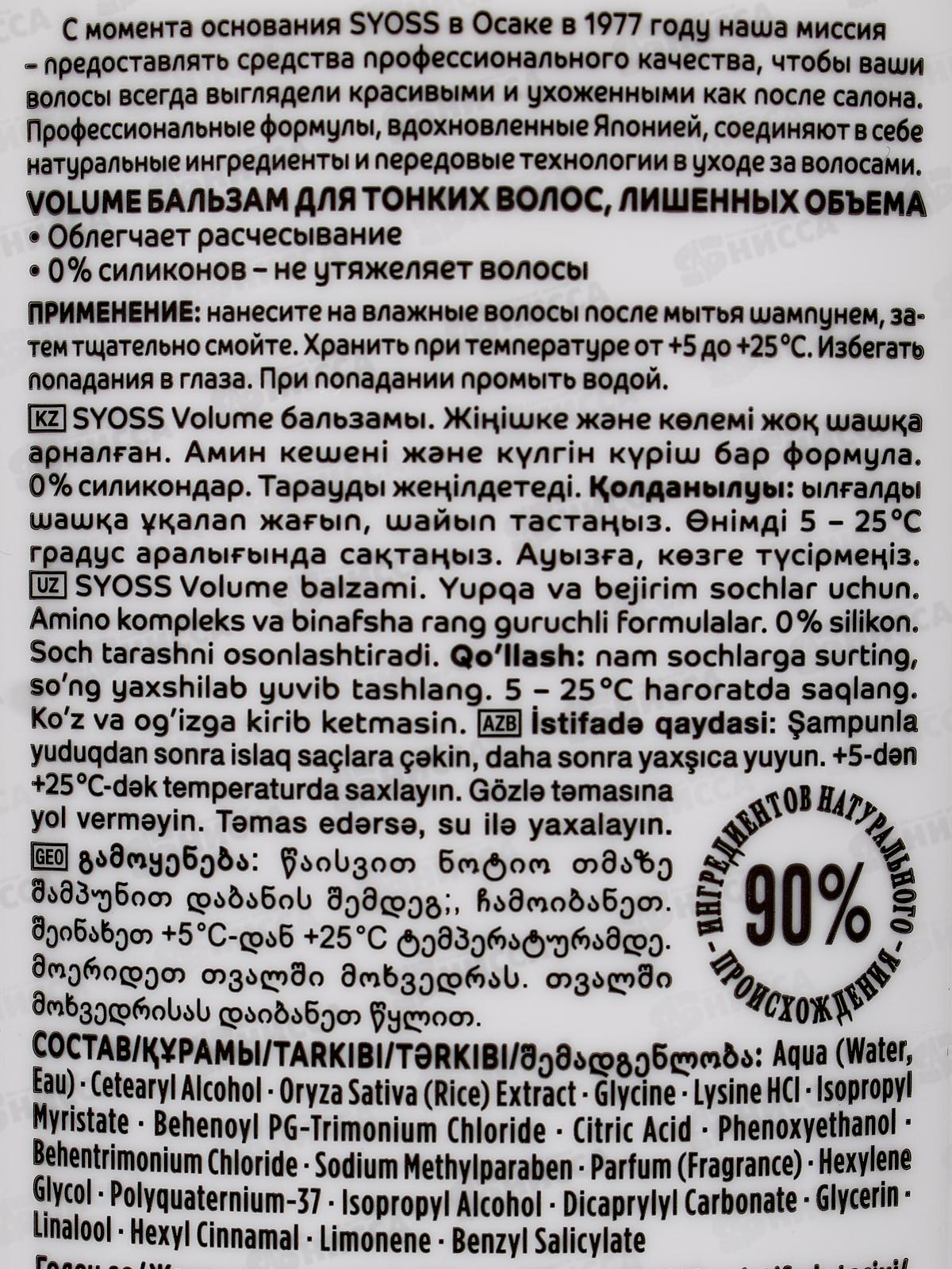 Состав: вода, цетеариловый спирт, экстракт Oryza Sativa (риса), глицин, лизин HCI, изопропилмиристат, хлорид бегеноил PG-тримония, лимонная кислота, феноксиэтанол, хлорид бегентримония, метилпарабен натрия, отдушка (парфюм), гексиленгликоль, поликватерниум-37, изопропиловый спирт, дикаприлил карбонат, глицерин, линалоол, гексилциннамаль, лимонен, бензилсалицилат.