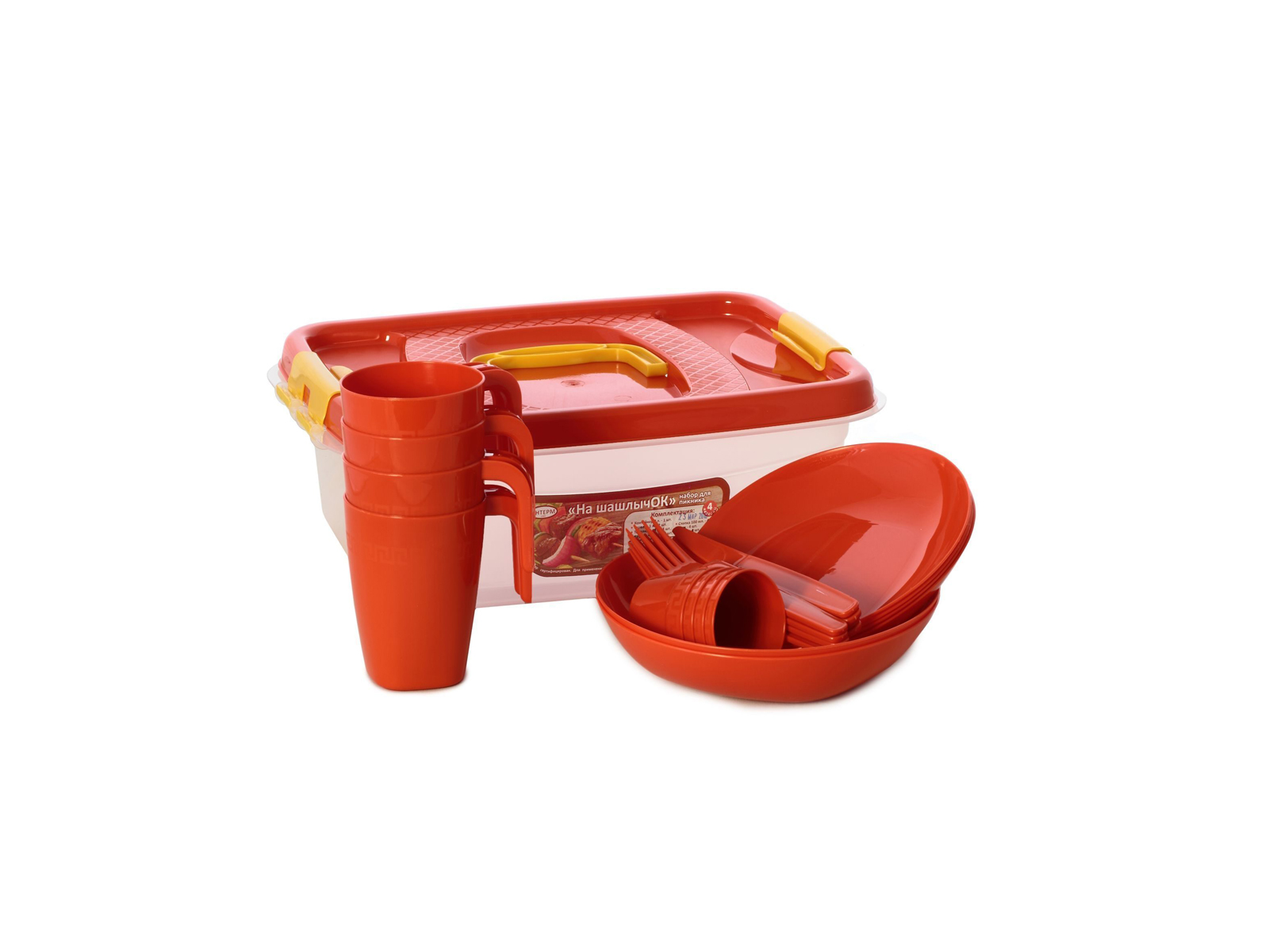 Состав набора: контейнер 12,5 л - 1 шт, блюдо для шашлыка с соусницей - 3 шт, доска разделочная 289х185х4,5 - 1 шт, миска 2,6 л -1 шт, тарелка 190х25,...