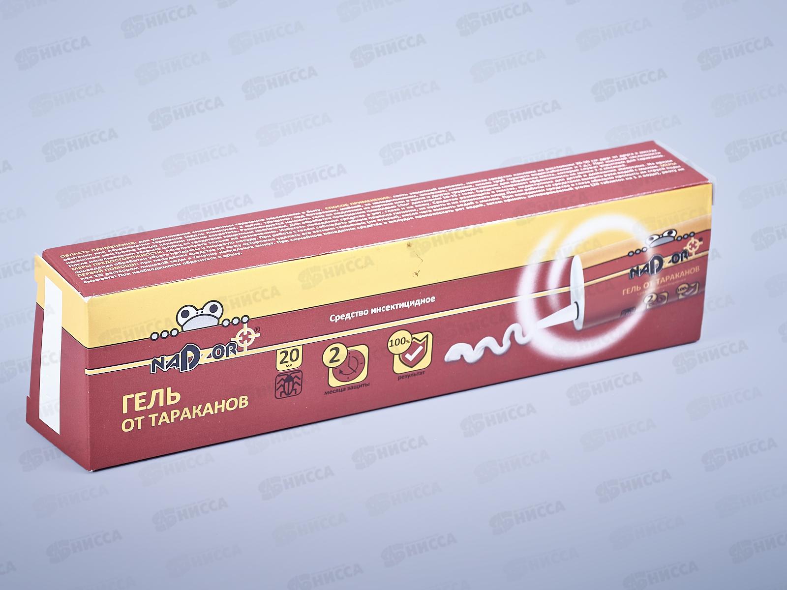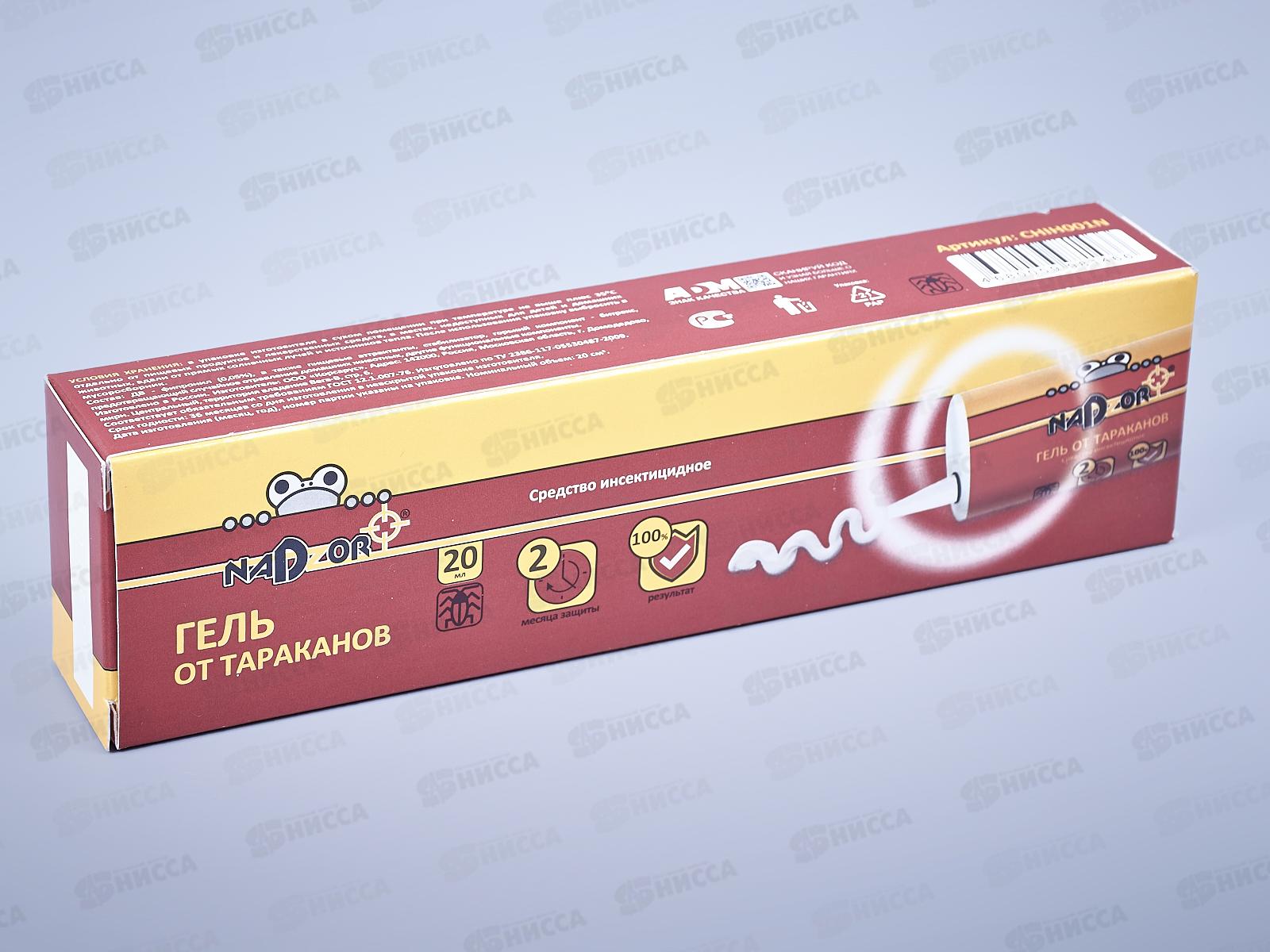 Средство инсектицидное гель от тараканов от бренда Nadzor. Используется населением в быту для уничтожения синантропных тараканов. Гель наносится каплями на расстоянии 20-50см друг от друга в местах обитания или перемещения тараканов. Состав: фипронил (0,05%), пищевые аттрактанты, стабилизатор, битрекс и другие функциональные компоненты.