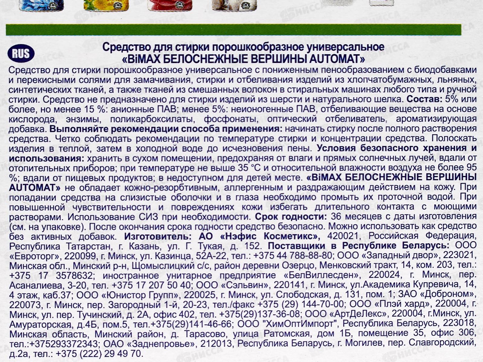 Состав: 5-15% анионные ПАВ, <5% неионогенные ПАВ, отбеливающие вещества на основе кислорода, цеолиты, поликарбоксилаты, энзимы, фосфонаты, оптический отбеливатель, ароматизирующая добавка.