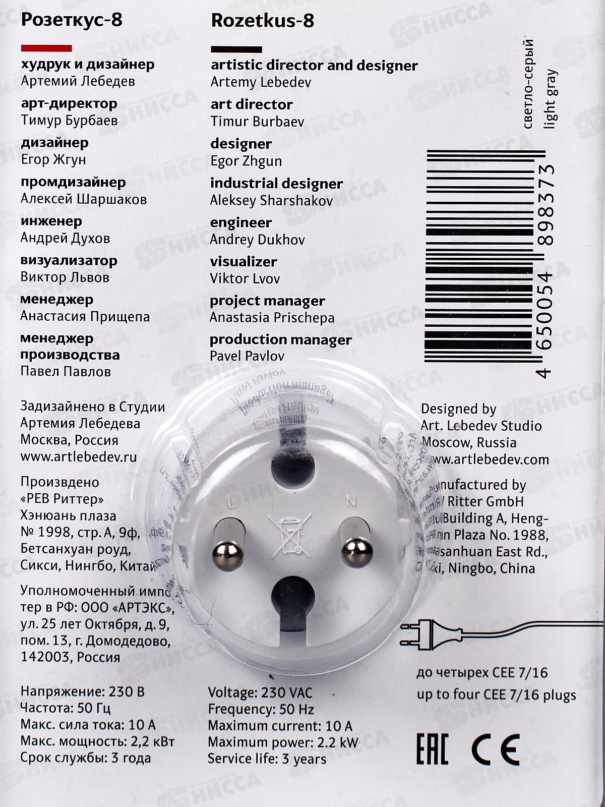 Переходник REV 3x3 на 4 розетки, подсветка, б/з, 10А, светло-серый, ART.LEBEDEV, 30001