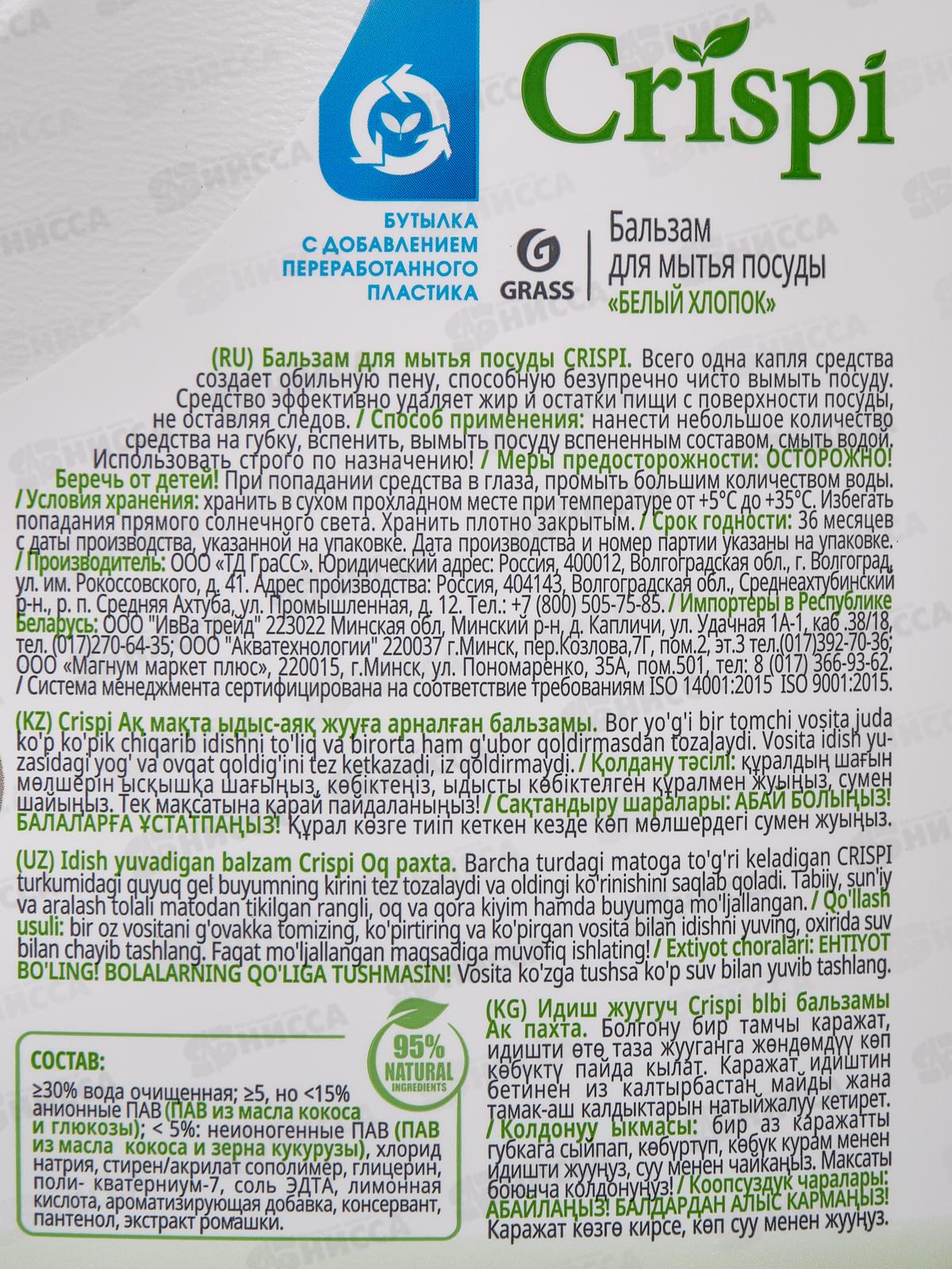 CRISPI бальзам для мытья посуды Белый хлопок 2500мл *4 125950