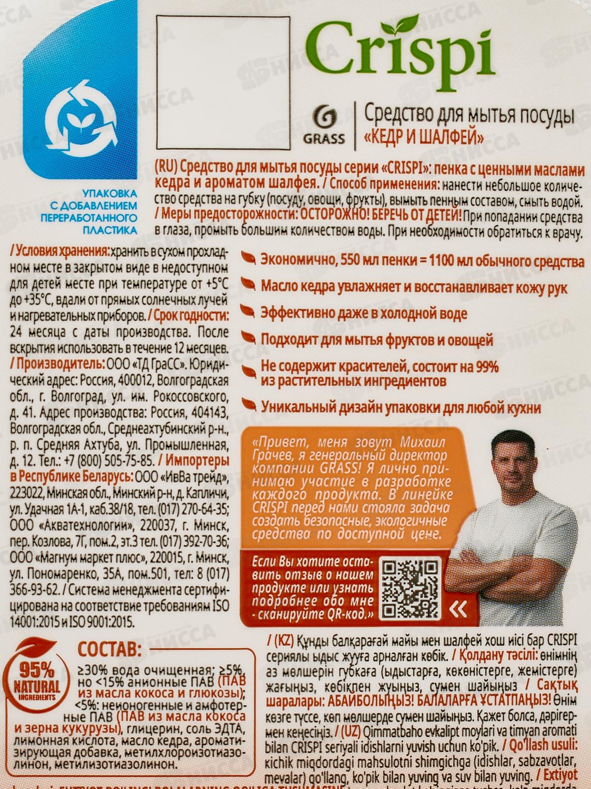 CRISPI средство для мытья посуды пенка с ценными маслами кедра и ароматом шалфея 550мл, 125997 *8