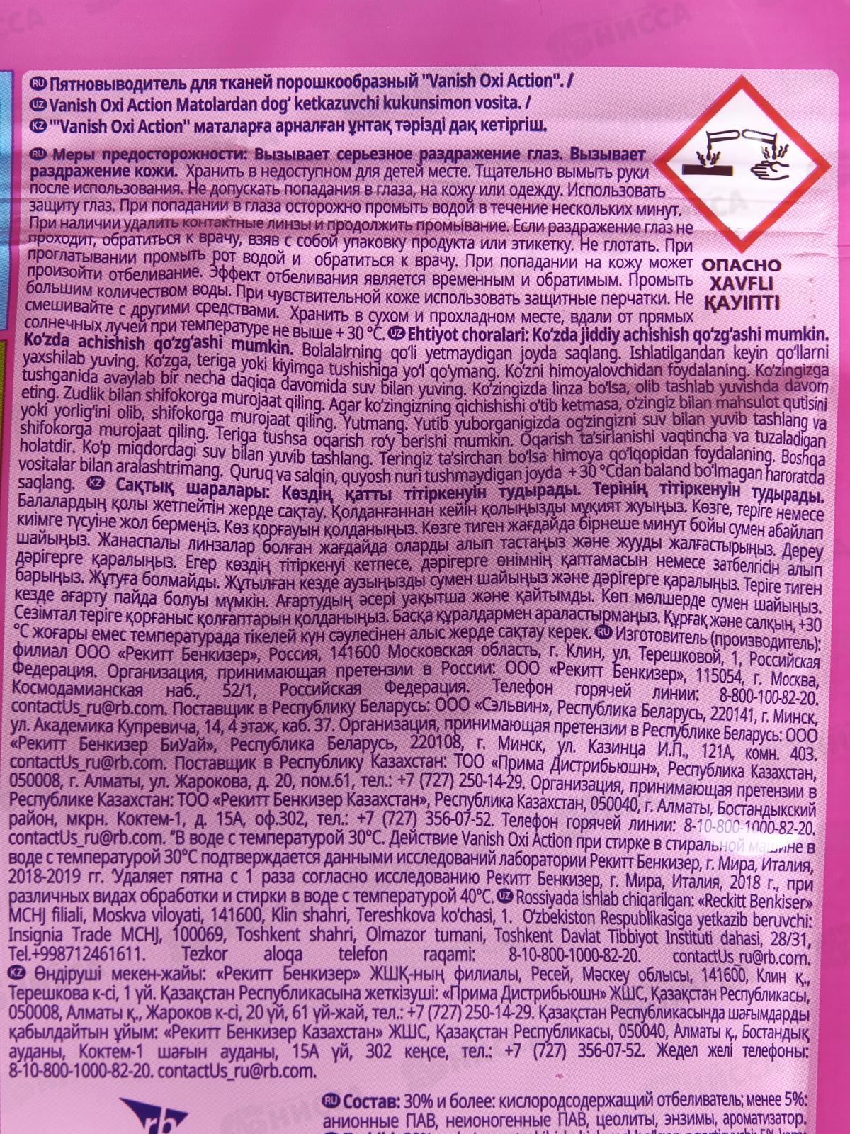 Состав: 30% кислородосодержащий отбеливатель, 5% анионные ПАВ, неионогенные ПАВ, цеолиты, энзимы, ароматизатор.