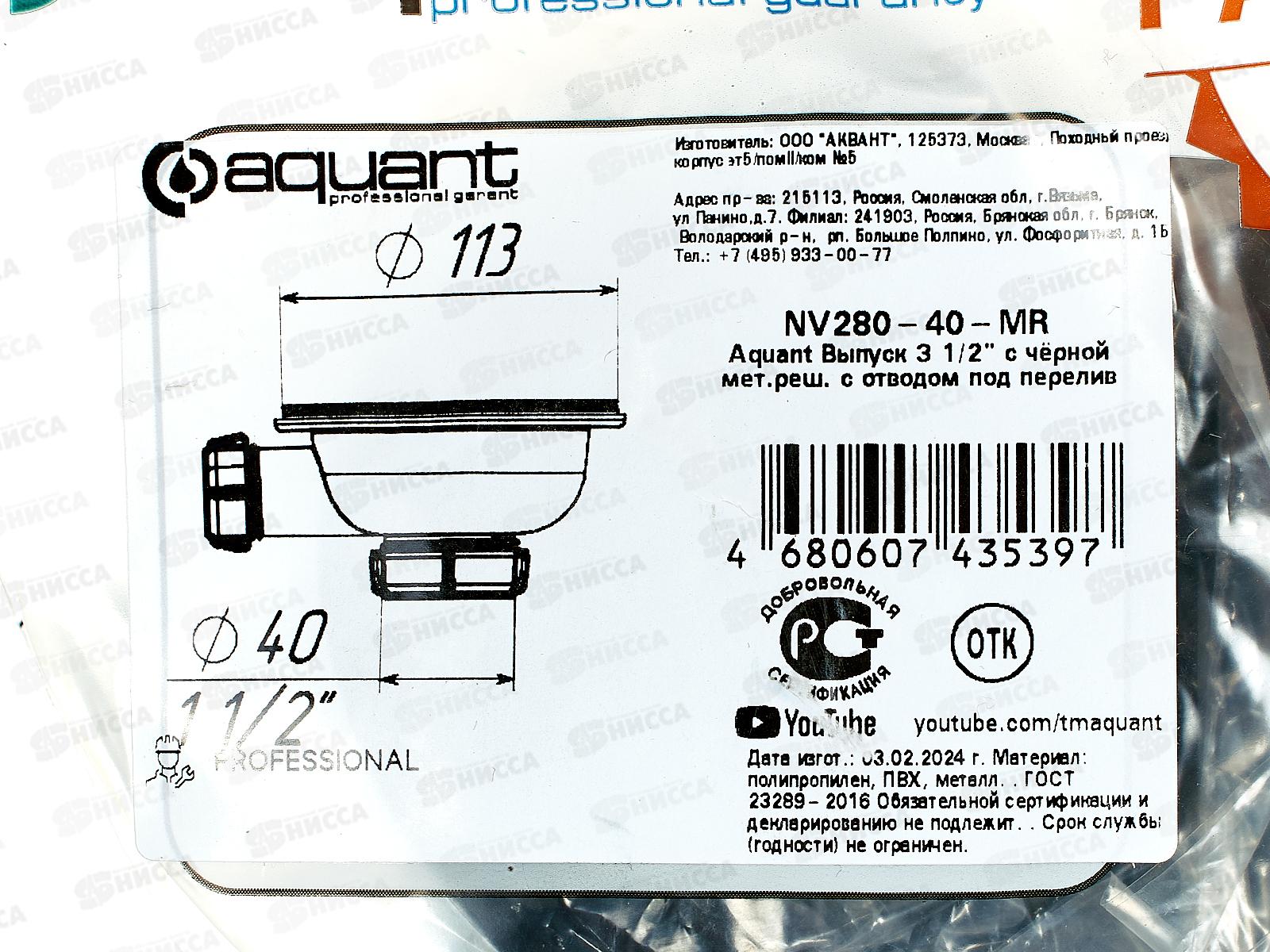 Выпуск 3 1/2" черный с металлической решеткой с отводом под перелив, NV280 *40