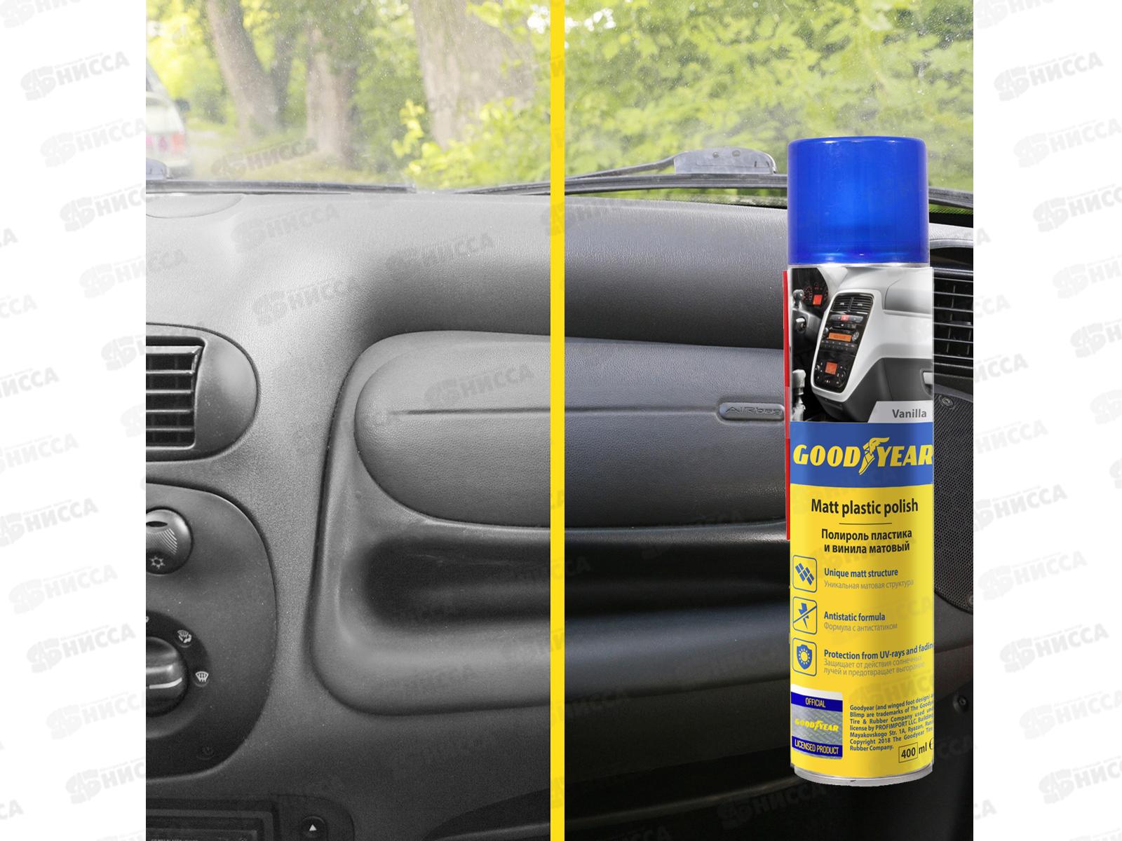 Полироль пластика и винила матовый с ароматом Ваниль Goodyear применяется для ухода за пластиковыми, резиновыми и виниловыми поверхностями интерьера автомобиля. Бережно удаляет загрязнения и полирует, возвращая элементам яркий цвет и создает эффектное матовое покрытие. Средство не оставляет липкого жирного следа. Благодаря антистатическим составляющим полироль защищает обработанную поверхность от пыли на длительный срок.