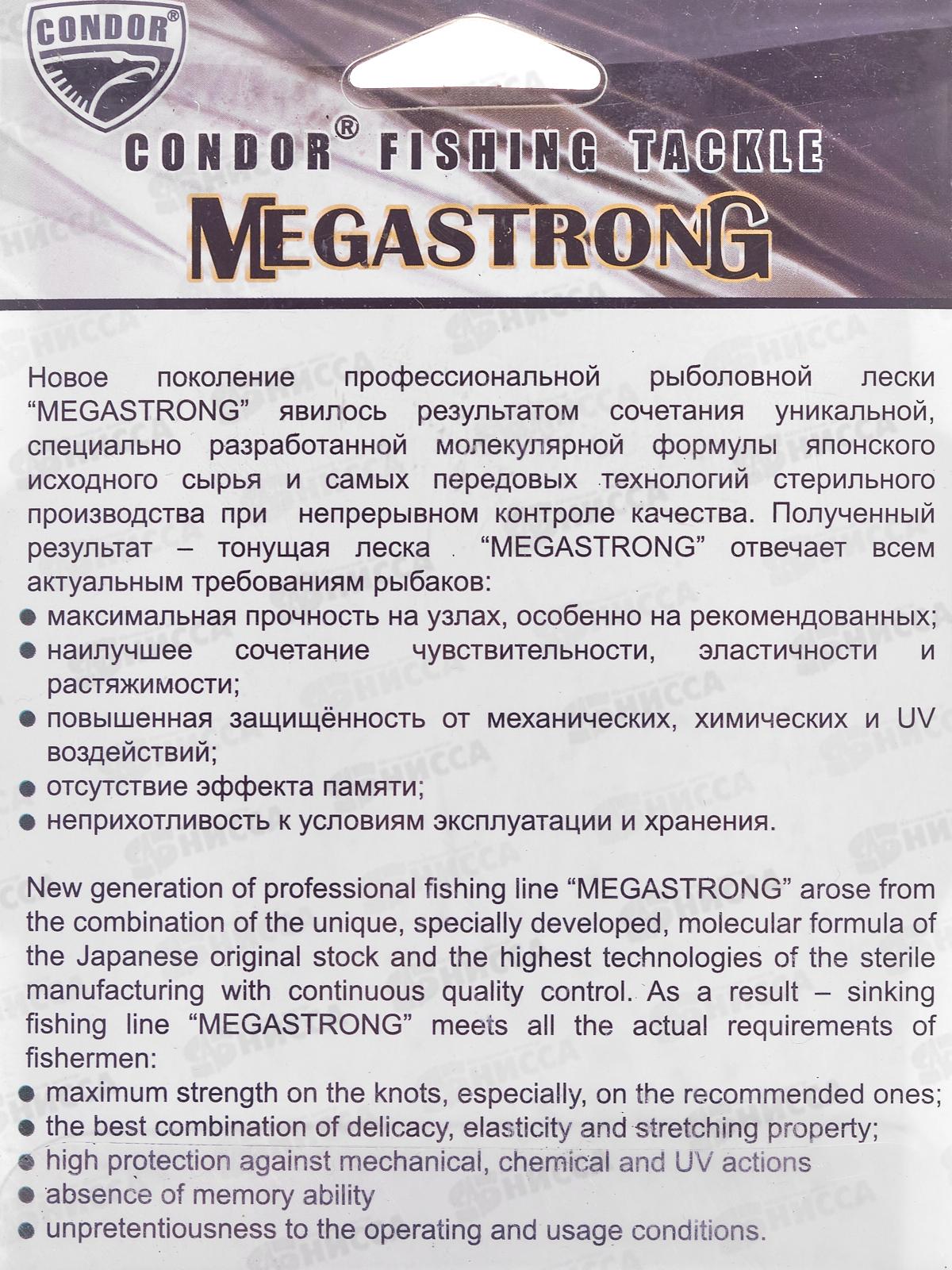 Новое поколение профессиональной рыболовной лески MEGASTRONG CONDOR явилось результатом сочетания уникальной специально разработанной молекулярной формулы японского исходного сырья и самых передовых технологий стерильного производства при непрерывном контроле качества. Полученный результат - тонущая леска MEGASTRONG отвечает всем актуальным требованиям рыбаков: максимальная прочность на узлах, повышенная защищенность от механических, химических и УФ воздействий, отсутствие эффекта памяти, наилучшее сочетание чувствительности, эластичности и растяжимости.
