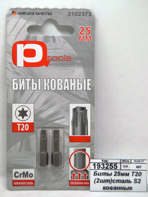 Код:193255; Биты 25мм Т20 (2шт)сталь S2 кованные торсионные магнит 3102373 Л