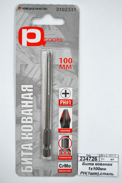 Код:234726; Бита кованая 1x100мм РН(1шт),сталь S2,торсионная, магнит 3102331