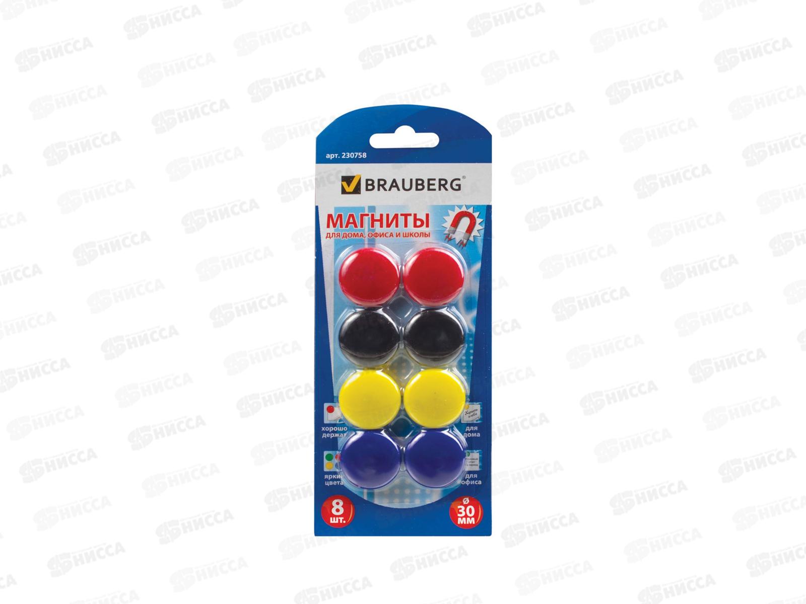 Код:012829; Магниты BRAUBERG 30мм 8шт, цветное покрытие, 230758 *24
