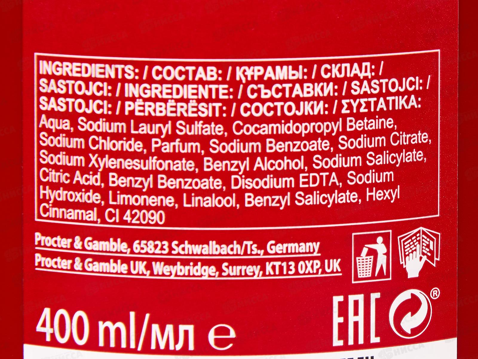 Состав: Вода, лауретсульфат натрия, хлорид натрия, лаурилсульфат натрия, ароматизатор, кокамидопропилбетаин, цитрат натрия, бензоат натрия, ксилолсульфонат натрия, лимонная кислота, бензилбензоат, динатриевая соль ЭДТА, лимонен, линалоол, бензилсалицилат, гексилциннамаль, нитрат магния, синий краситель (CI?42090), метилхлоризотиазолинон, хлорид магния, метилизотиазолинон.
