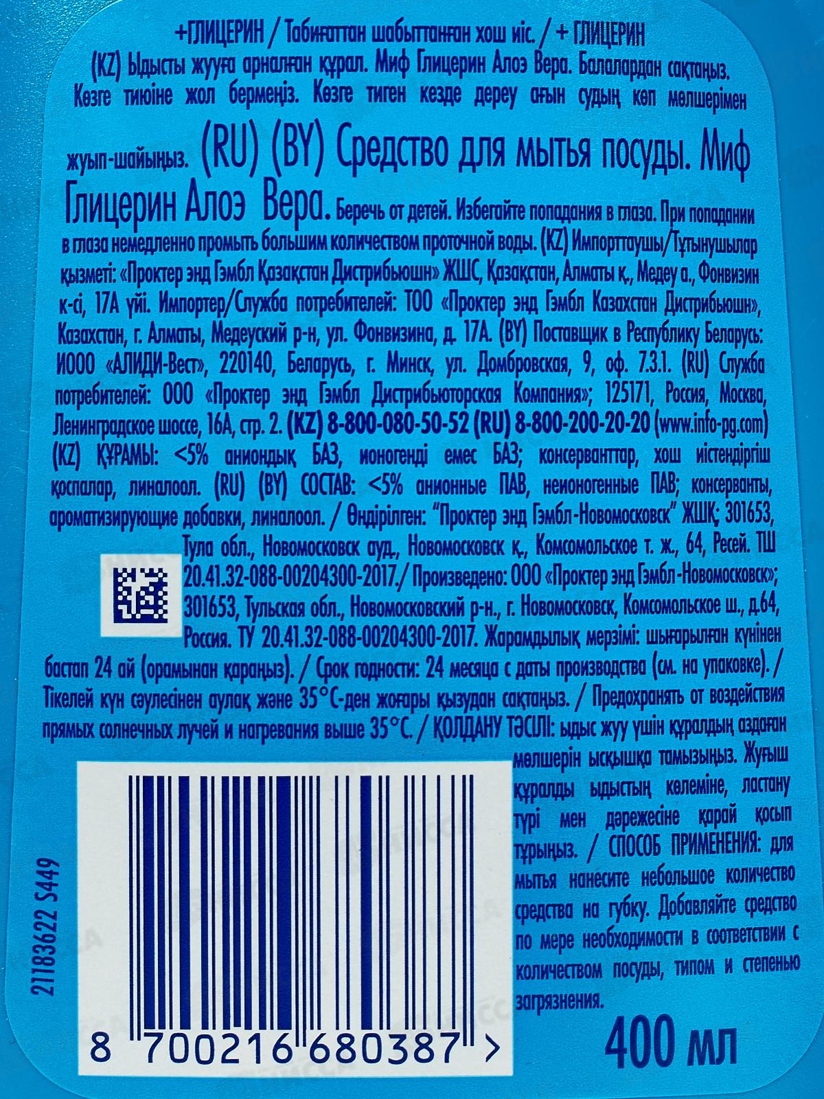 МИФ для посуды 400мл Глицерин Алоэ Вера *21