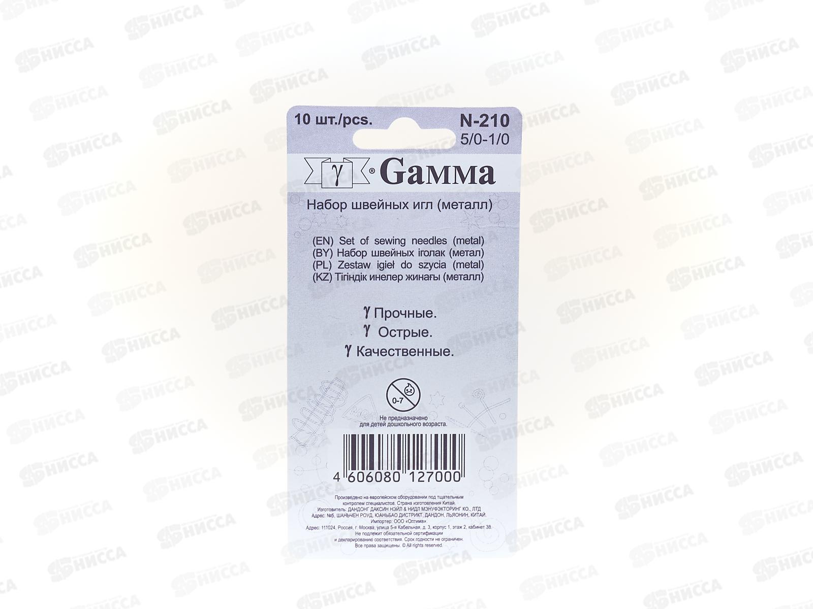 Иглы для шитья ручные "Gamma" N-210 для шитья №5/0-1/0 10шт блистер