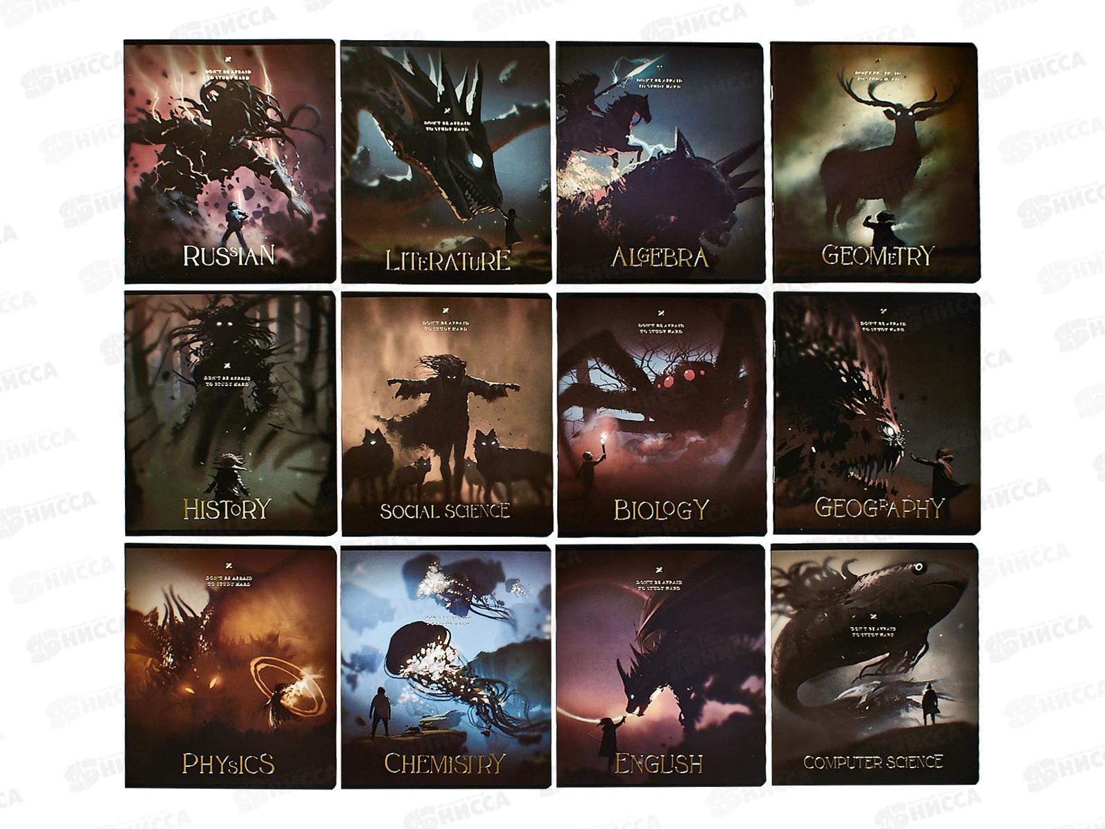 В комплекте 12 тетрадей: география, химия, литература, русский язык, алгебра, информатика, обществознание, геометрия, история, физика, биология, английский язык.