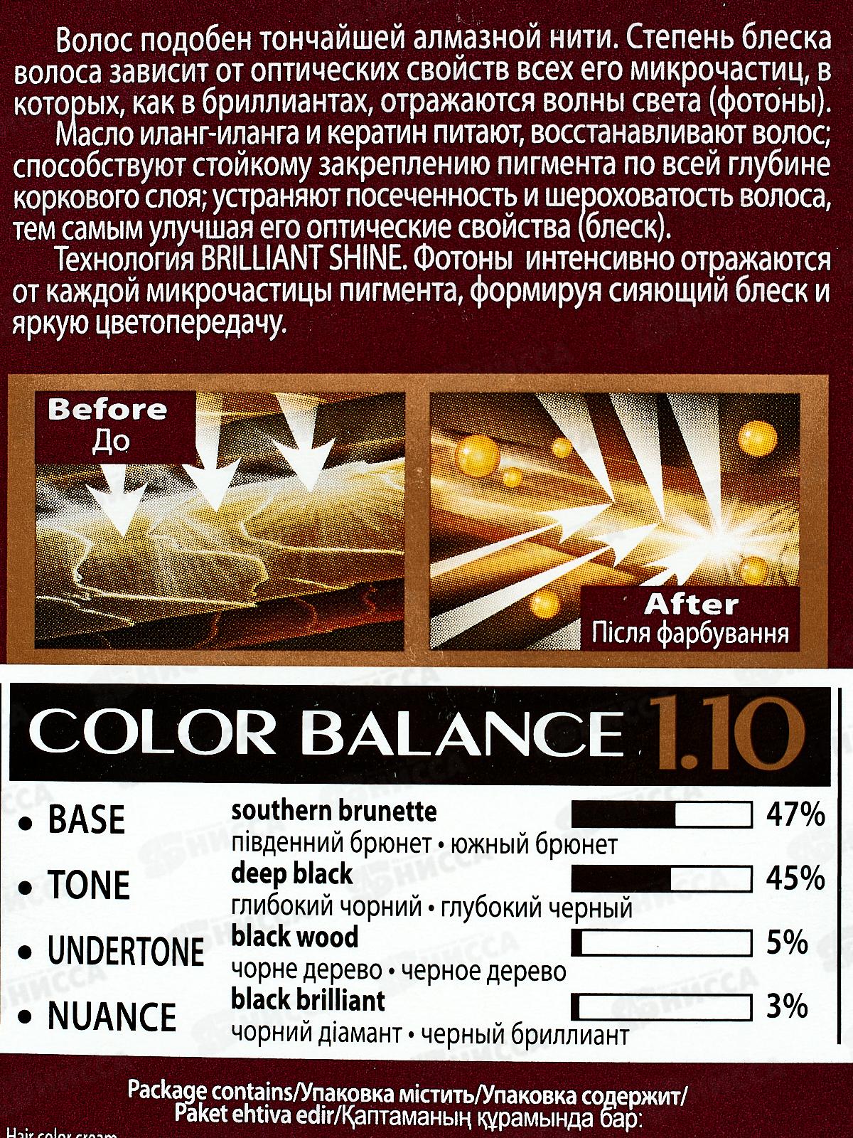 Стойкая крем-краска, тон № 1.10 Черный диамант Элитан обладает интенсивным и натуральним цветом. На 100% закрашивает седину. Придаёт волосам роскошний блеск. Входящее в состав краски масло иланг-иланга питает, восстанавливает волосы. Способствует стойкому закреплению пигмента по всей глубине коркового слоя. Устраняет посеченность и шероховатость волоса, тем самым улучшая его оптические свойства (блеск). Стойкая крем-краска Элитан Hair Color Cream содержит новую технологию окрашивания Brilliant Shine c масом ylang-ylang. Фотоны интенсивно отражаются от каждой микрочастицы пигмента, формируя сияющий блеск и обеспечивая полную цветопередачу. В упаковке следующие средства: крем-краска для волос - 2 саше х 25 мл, эмульсия окислительная ОксиЭлитан - 2 саше х 25 мл, питательная краска-бальзам - 1 саше х 15 мл, комфортные перчатки - 1 пара, инструкция.