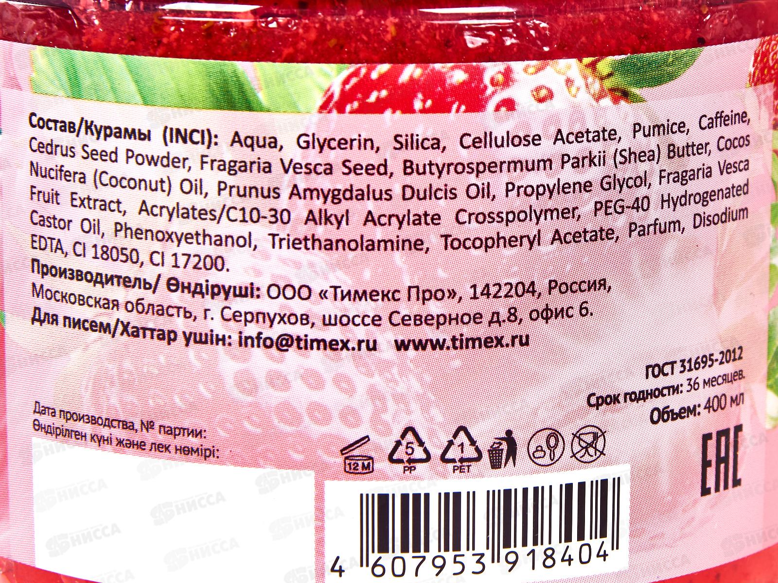 Состав: вода, Глицерин, диоксид кремния, ацетат целлюлозы, пемза, кофеин, порошок семян кедра, семена земляники лесной, масло ши (Butyrospermum Parkii), масло кокоса (Coconut), масло сладкого миндаля (Prunus Amygdalus Dulcis), пропиленгликоль, экстракт плодов земляники лесной, кроссполимер акрилатов/C10-30 алкилакрилата, гидрогенизированное касторовое масло ПЭГ-40, феноксиэтанол, триэтаноламин, токоферола ацетат, отдушка, динатриевая соль ЭДТА, CI 18050, CI 17200.