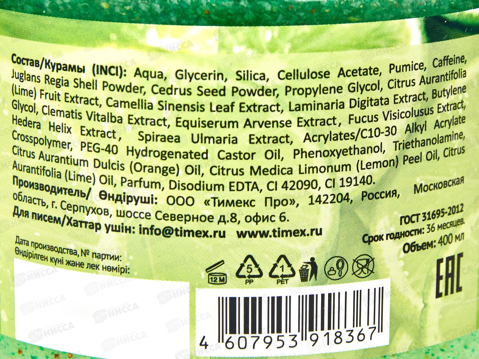 Состав: вода, Глицерин, диоксид кремния, ацетат целлюлозы, пемза, кофеин, порошок скорлупы грецкого ореха (Juglans Regia), порошок семян кедра, пропиленгликоль, экстракт плодов лайма (Citrus Aurantifolia), экстракт листьев зеленого чая (Camellia Sinensis), экстракт ламинарии пальчатой (Laminaria Digitata), бутиленгликоль, экстракт клематиса (Clematis Vitalba), экстракт хвоща полевого (Equiserum Arvense), экстракт фукуса висиколюса (Fucus Visicolusus), экстракт плюща (Hedera Helix), экстракт таволги вязолистной (Spiraea Ulmaria), кроссполимер акрилатов/C10-30 алкилакрилата, гидрогенизированное касторовое масло ПЭГ-40, феноксиэтанол, триэтаноламин, масло апельсина (Citrus Aurantium Dulcis), масло лимона (Citrus Medica Limonum), масло лайма (Citrus Aurantifolia), парфюмерная композиция, динатриевая соль ЭДТА, CI 42090, CI 19140.