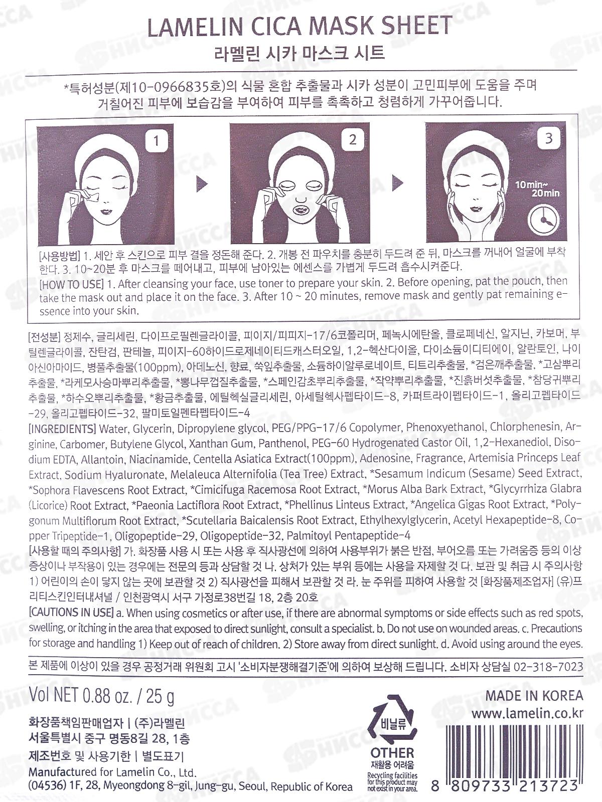 Lamelin Маска для лица тканевая 23гр Увлажн Успок центелла 10шт уп *40