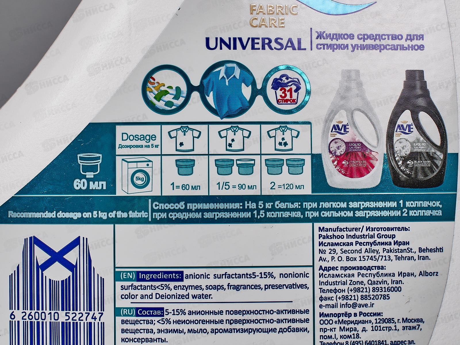 AVE Жидкое средство для стирки Универсальное 1900мл 9106 *6