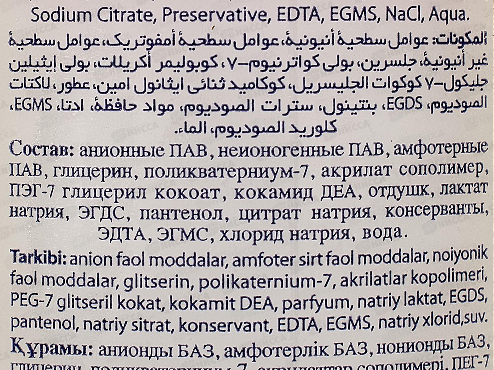 Состав: анионные ПАВ; неионогенные ПАВ; амфотерные ПАВ; глицерин; поликватерниум-7; акрилат сополимер; ПЭГ-7; глицерил кокоат; кокамид ДЕА; отдушка; лактат натрия; ЭГДС; пантенол; цитрат натрия; консерванты; ЭДТА; ЭГМС; хлорид натрия; вода.