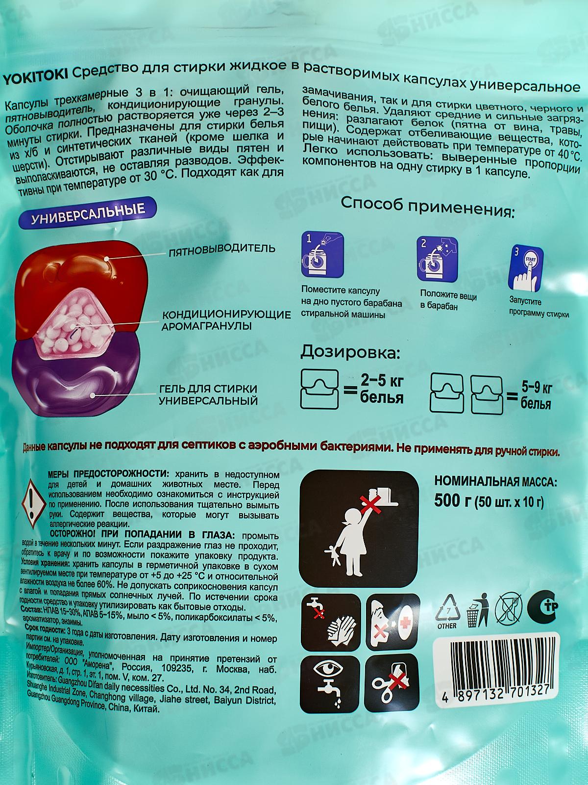 YOKITOKI Средство для стирки жидкое в капсуле 3х камерной универсальное 50шт 1327 *8