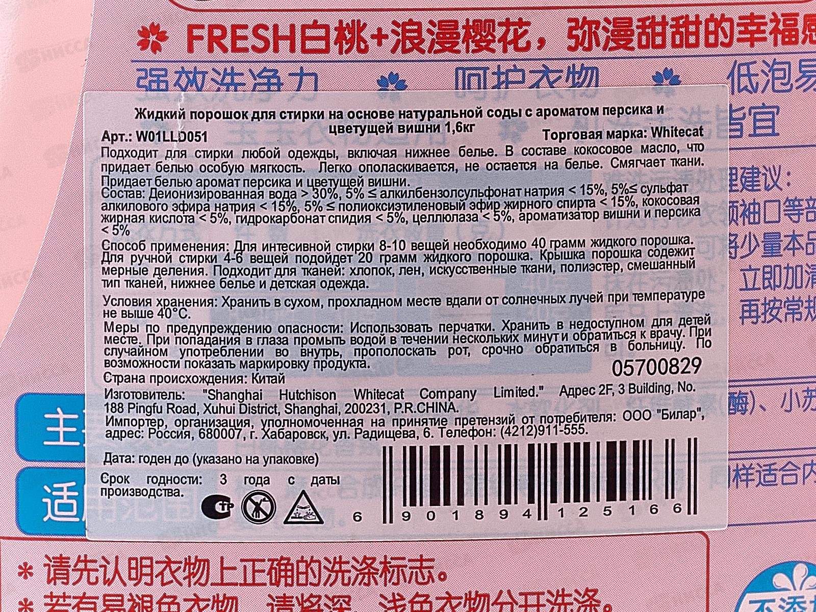 Состав: алкилбензолсульфонат натрия 5-10%, сульфат алкилового эфира натрия 5-15%, полиоксиэтиленовый эфир жирного спирта 3-10%, кокосовая жирная кислота 1-3%, гидрокарбонат спидия 0,2-3%, целлюлаза 0,1-1%, деионизированный вода 40-70%, ароматизатор вишни и персика.